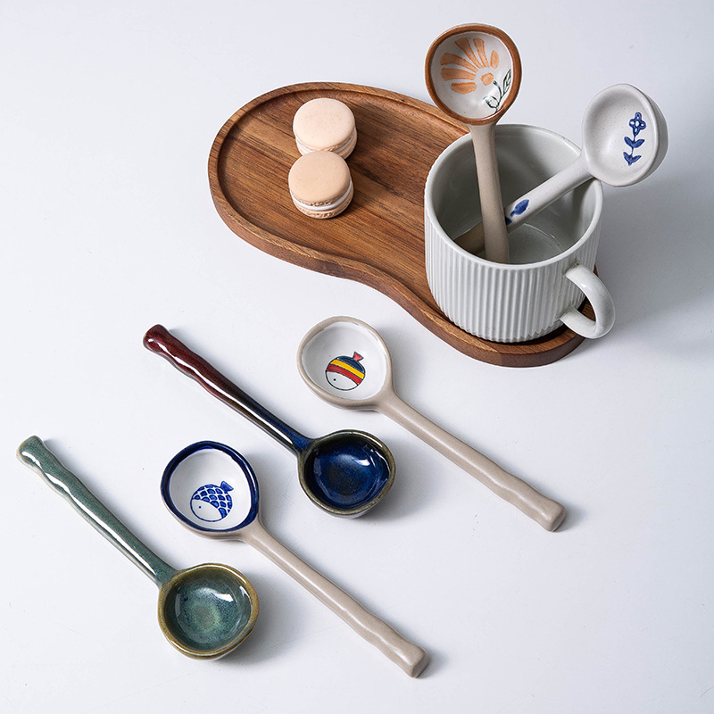 セラミック耐熱コーヒースプーン長柄レトロ日本式陶土味付け攪拌スプーン卸売り粗陶手作りins風小