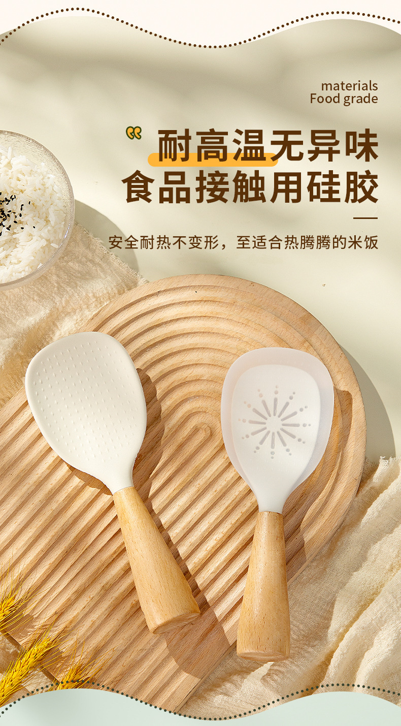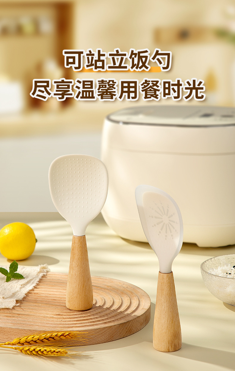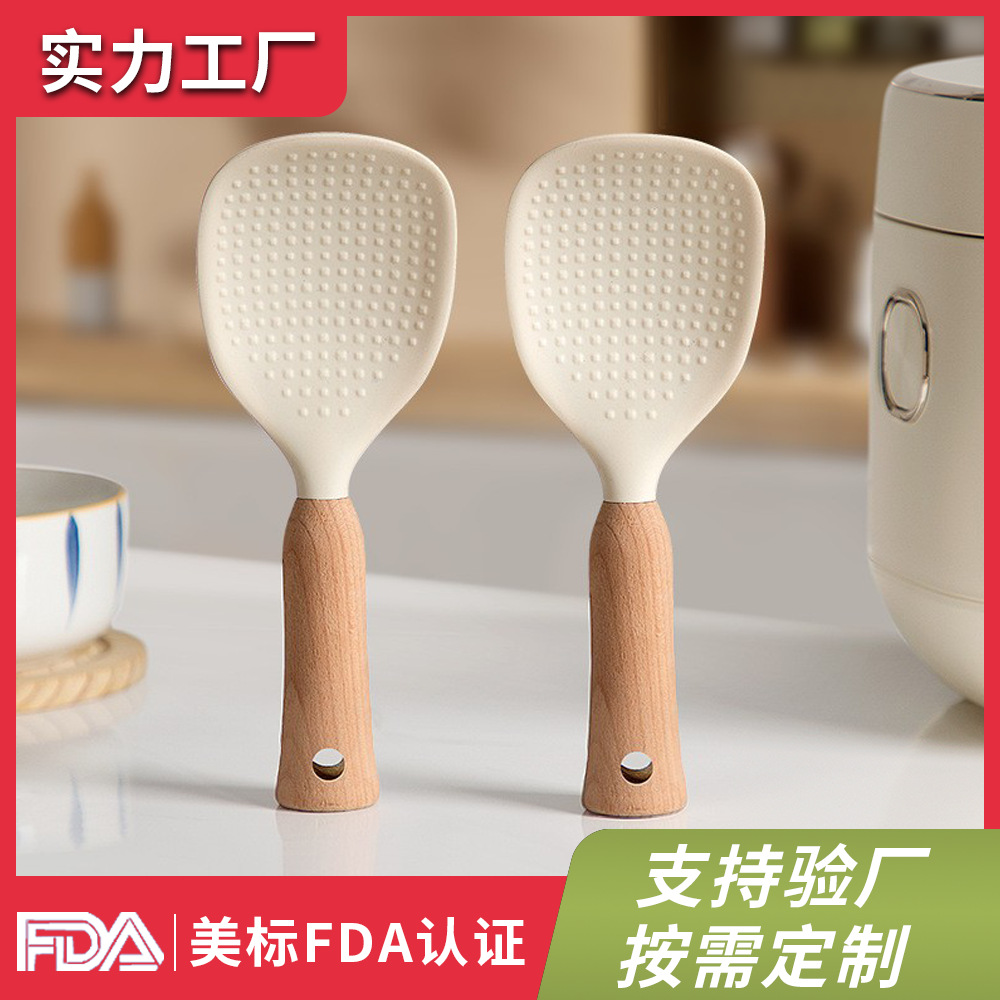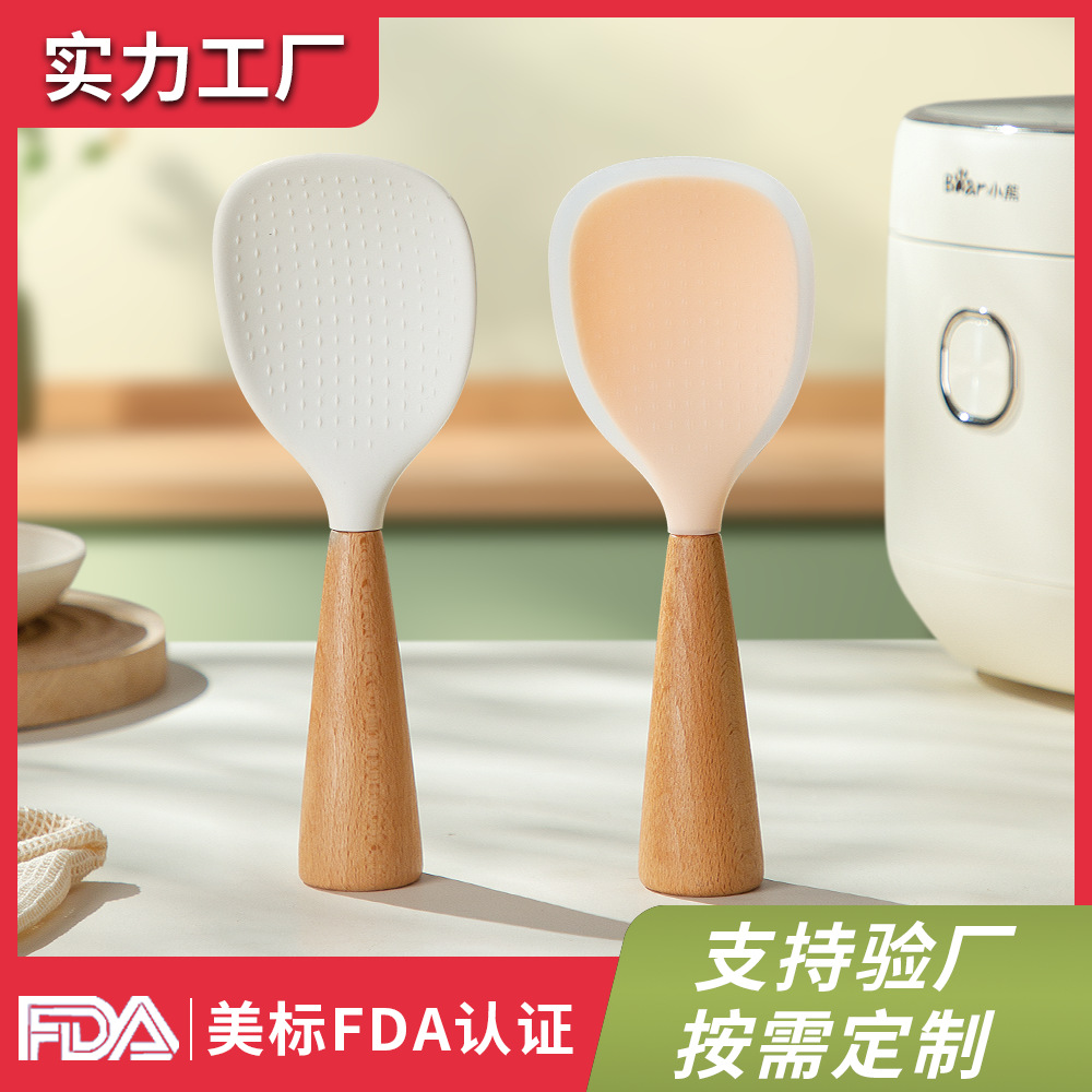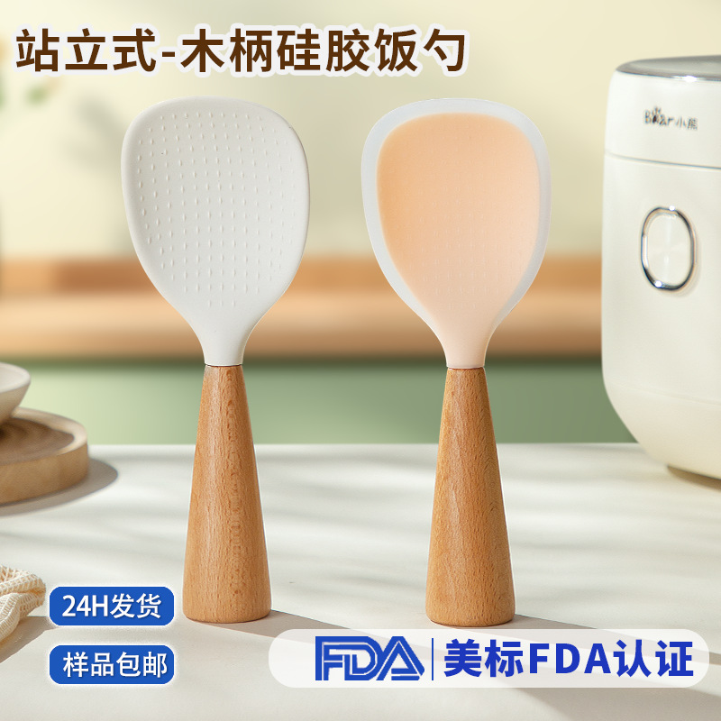 シリコン製のブナ材ハンドル付きしゃもじ、焦げ付き防止、家庭用、立てて保管可能、シリコンしゃもじ。