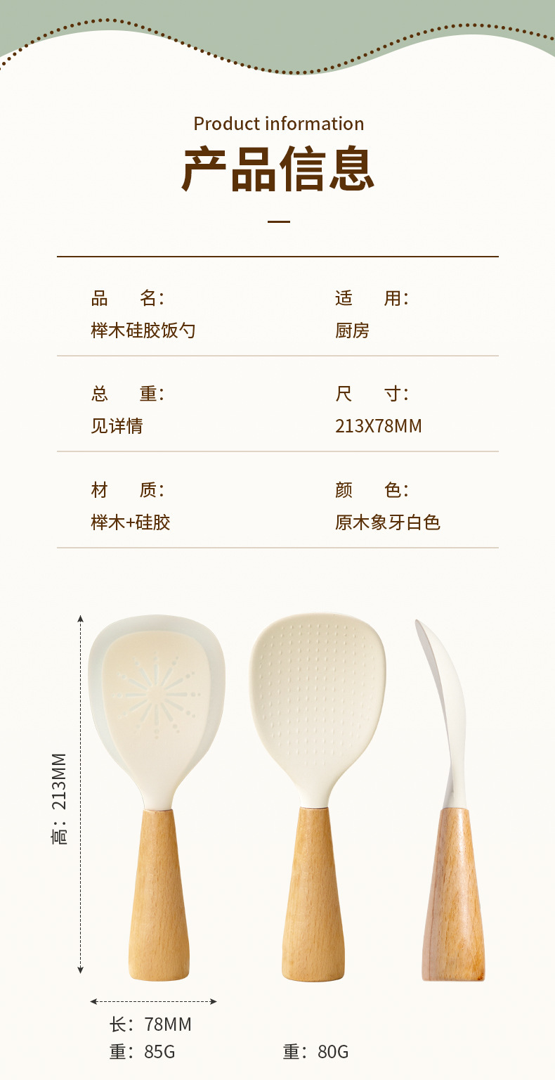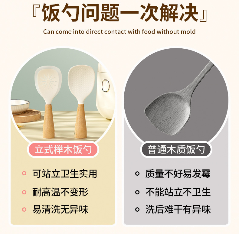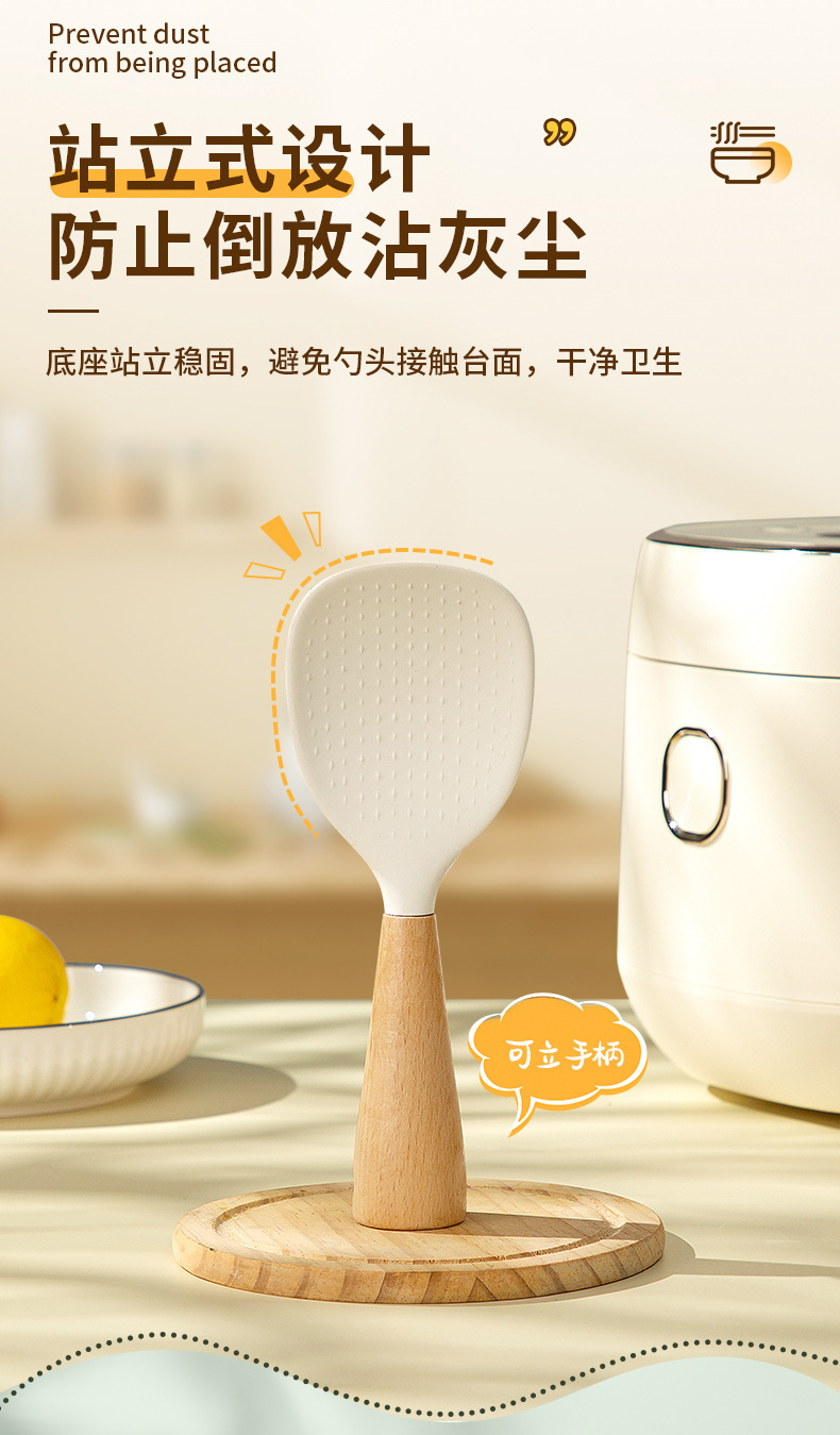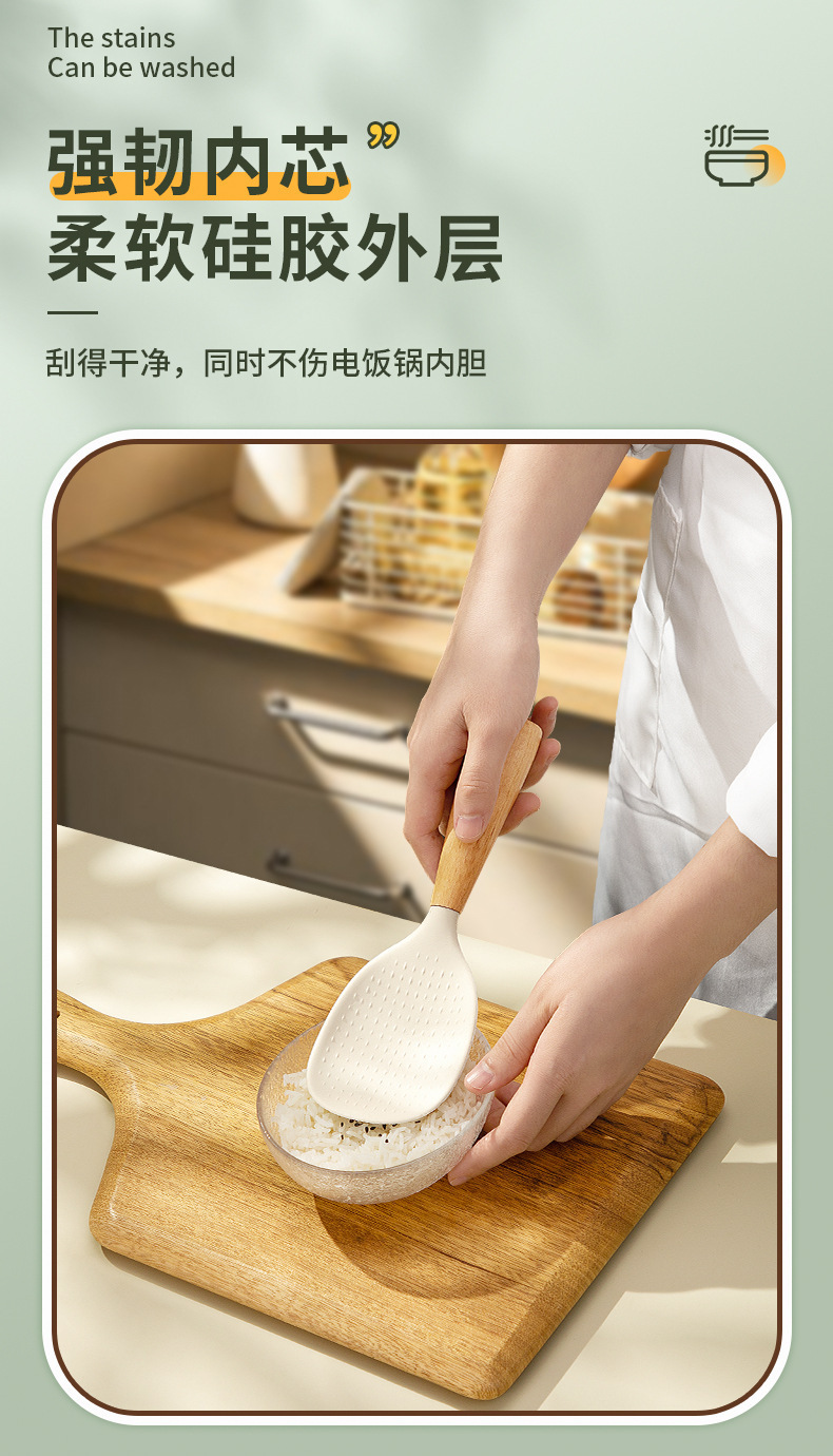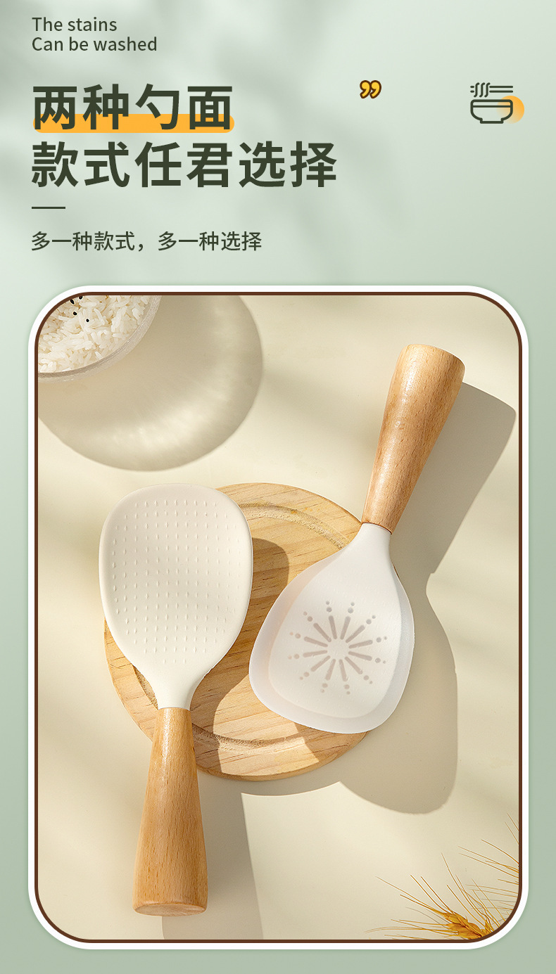 シリコン製のブナ材ハンドル付きしゃもじ、焦げ付き防止、家庭用、立てて保管可能、シリコンしゃもじ。