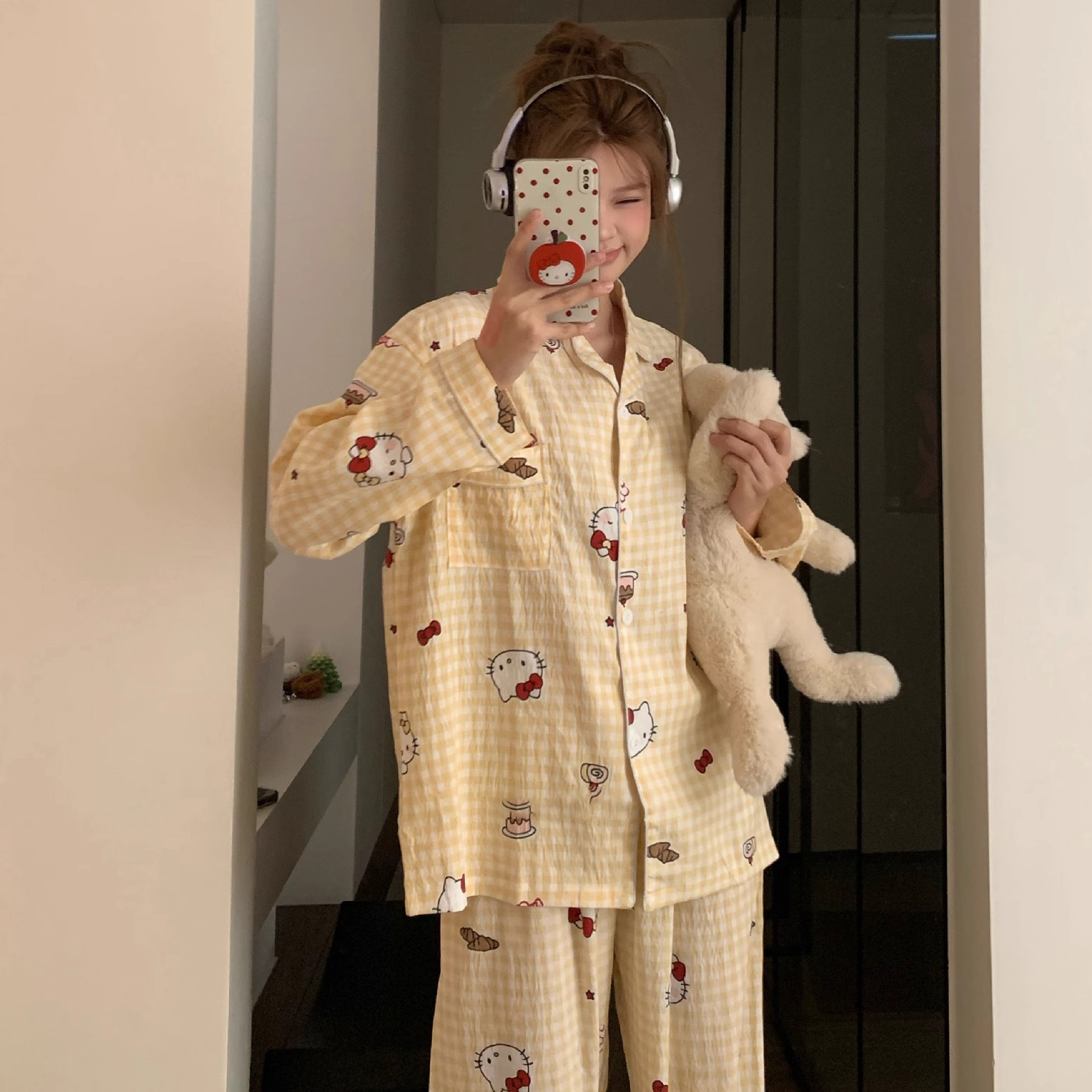 雲の綿のガーゼのパジャマの女性の春と秋の漫画の格子の長袖のスーツのinsの越境する部屋の服の日系のかわいいです。