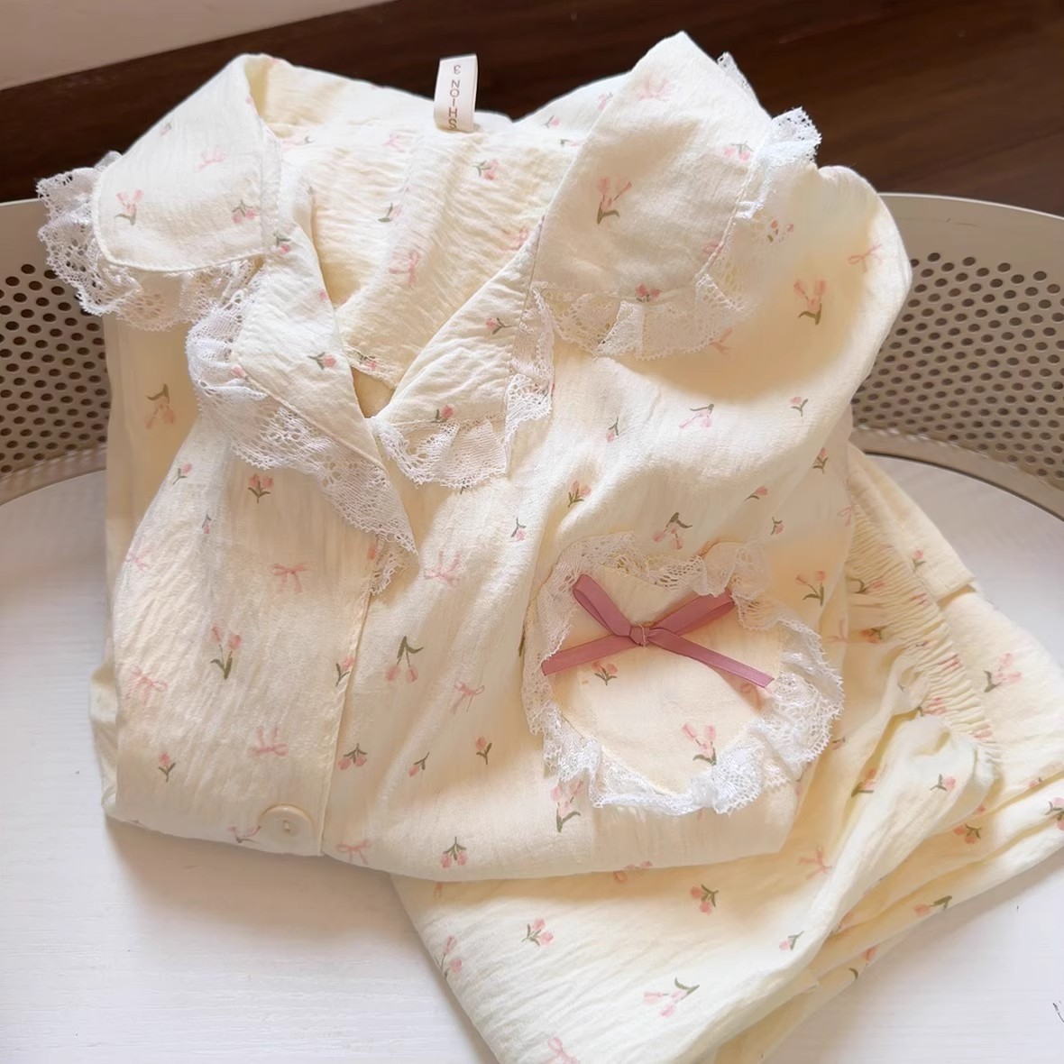 砕花パジャマ女性春秋タイプ長袖セットins雲綿ガーゼクロスボーダー家庭服かわいい甘いレース