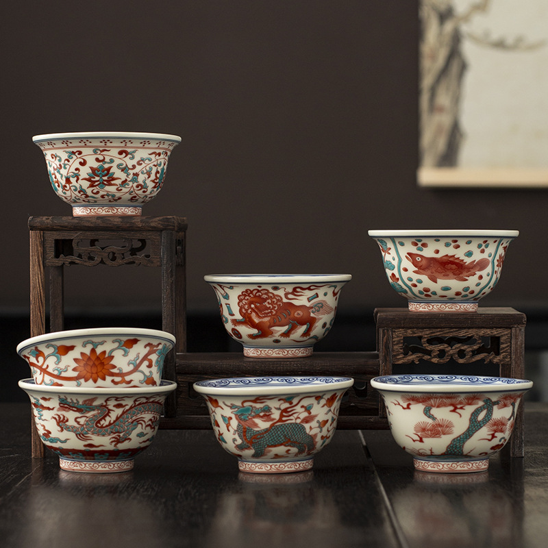 仿古红绿彩缠枝莲纹茶杯压手杯陶瓷功夫茶具泡茶杯家用个人专用杯