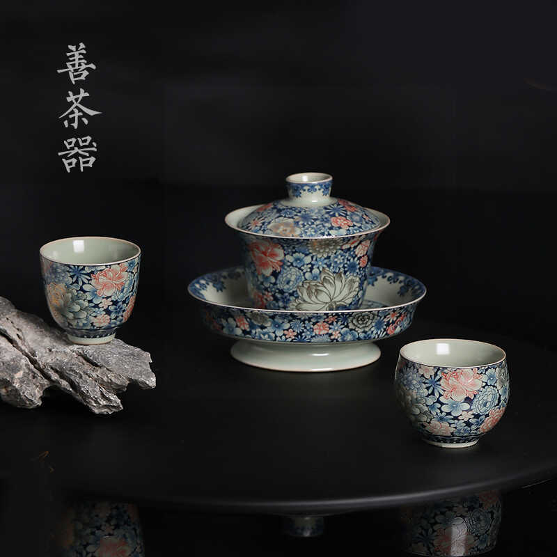 敦煌仏像山水青花磁器釉薬下彩蓋碗工夫茶道具レトロ陶磁泡茶三才蓋碗茶碗