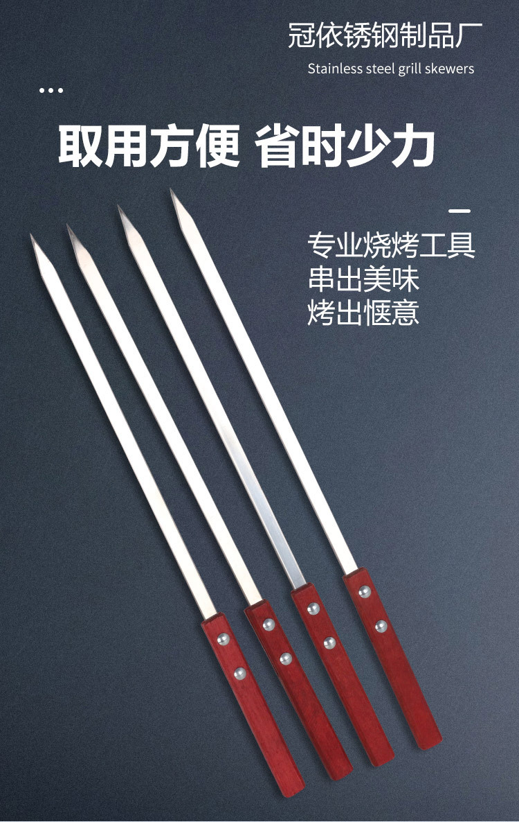業務用大型串焼き串、長くて厚い鋼串、串焼き用平串、ステンレス製角木柄羊肉串
