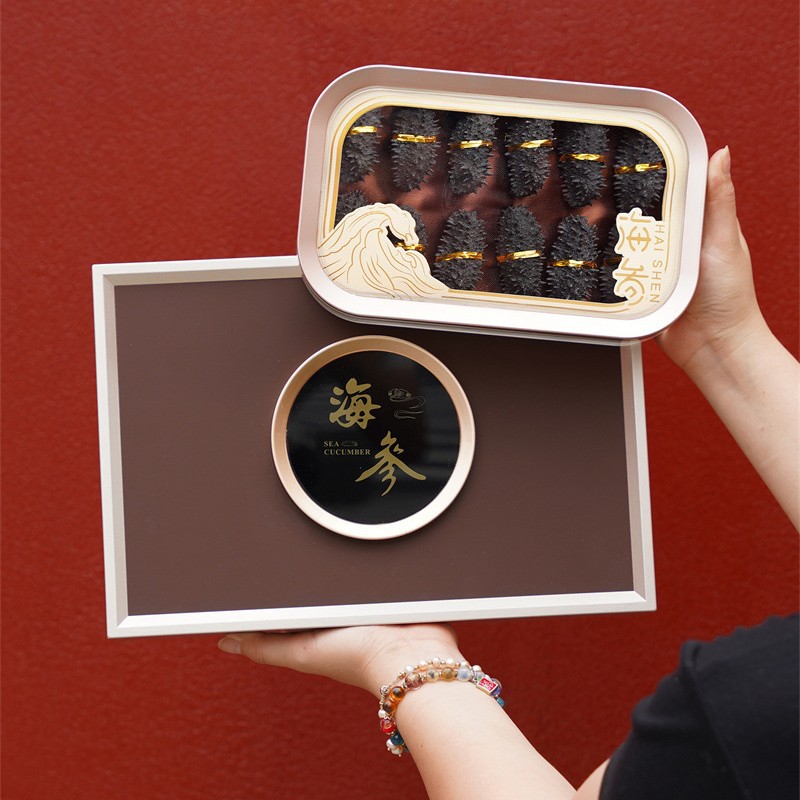 新商品のナマコの包装箱のギフトボックスの茶色の500グラムはアクリルの内箱の乾ナマコの包装箱の皮箱の卸売りを詰めます。
