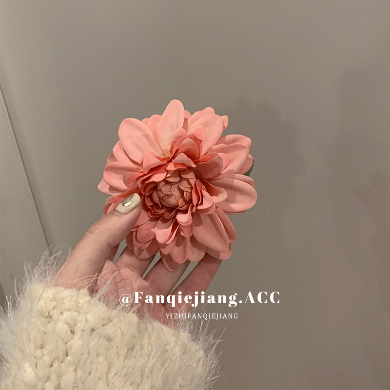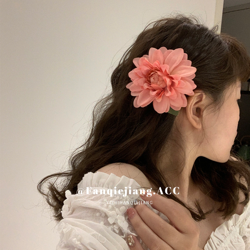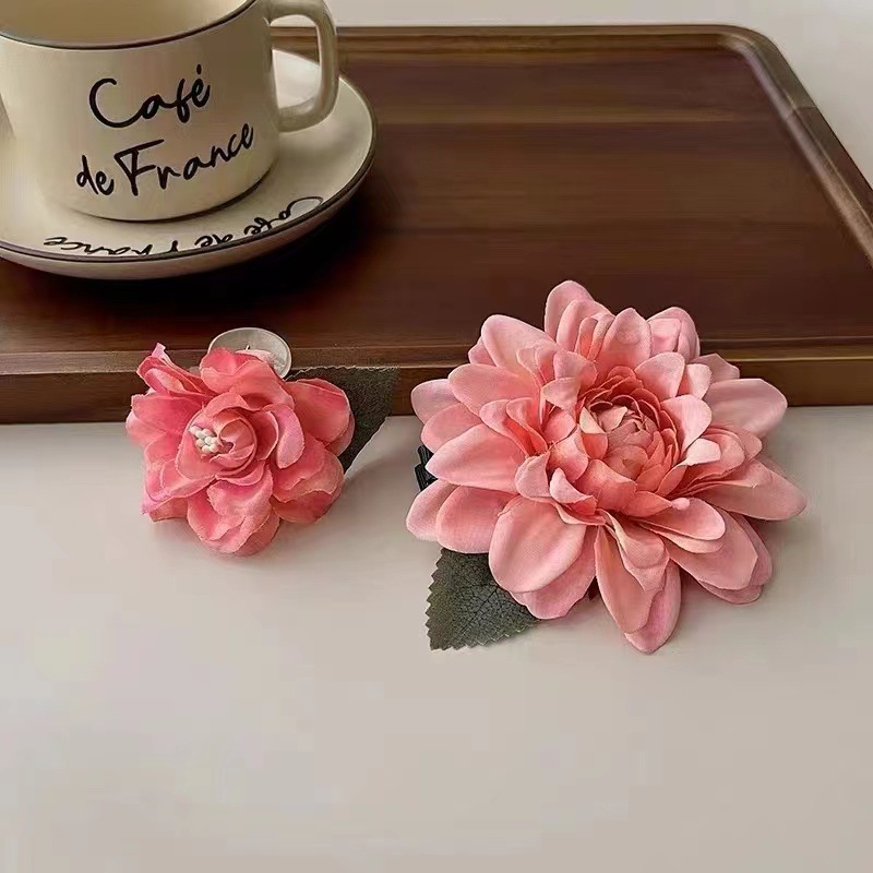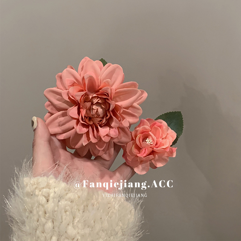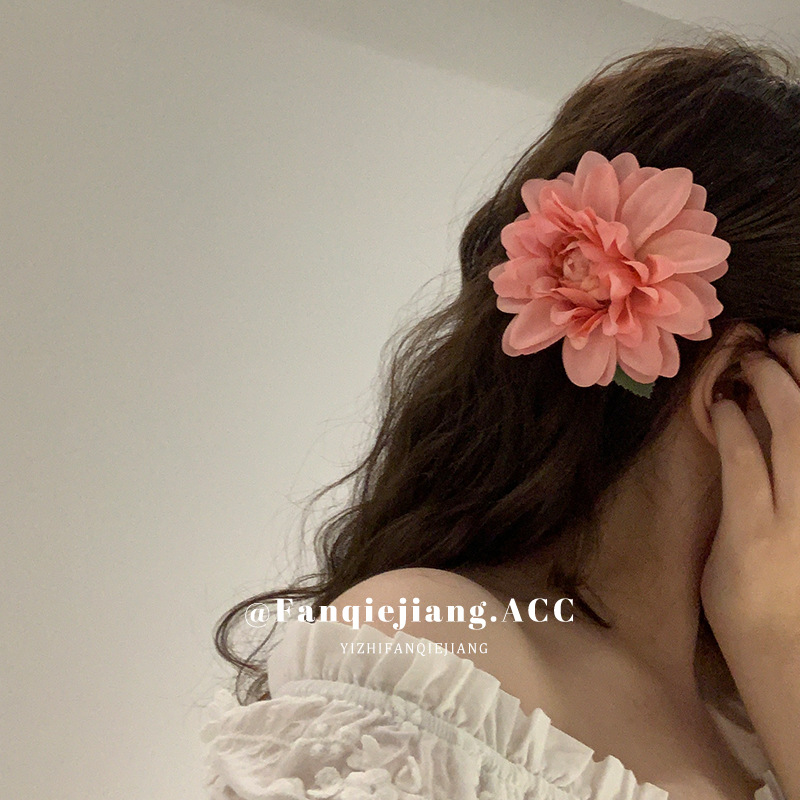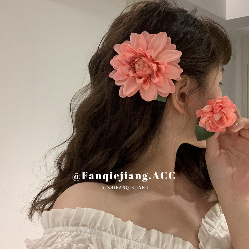 夏のリゾート風ツバキの花のヘアピンの新型ピンクの花のヘアピンの高い顔の値の側は海辺を挟んで写真を撮ります。