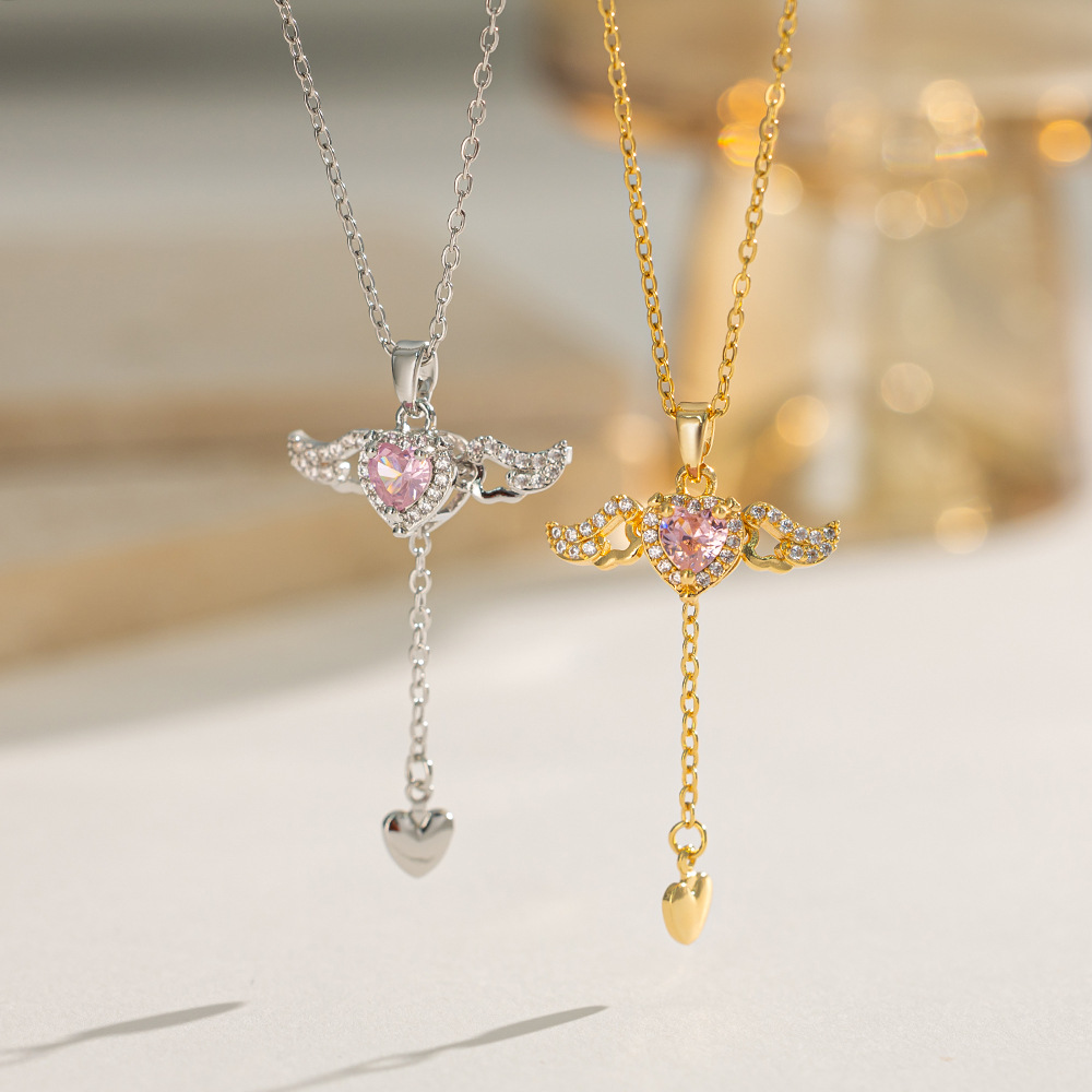2025年秋冬人気新作キューピッドハートタッセルネックレスアクセサリー女性用ピンクダイヤモンドペンダント羽デザインジュエリー