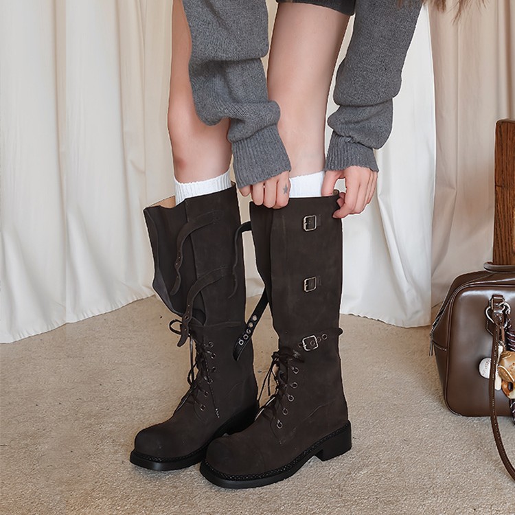 复古绑带西部牛仔长靴粗跟搭扣2025新款做旧美拉德高筒骑士马丁靴