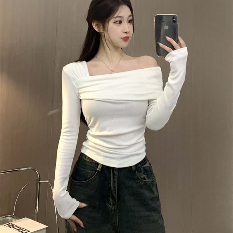 ワンショルダーデルロン保温Tシャツ レディース 春秋冬新作 スリムフィット 細見え 甘辛ミックス インナー ベースレイヤー トップス