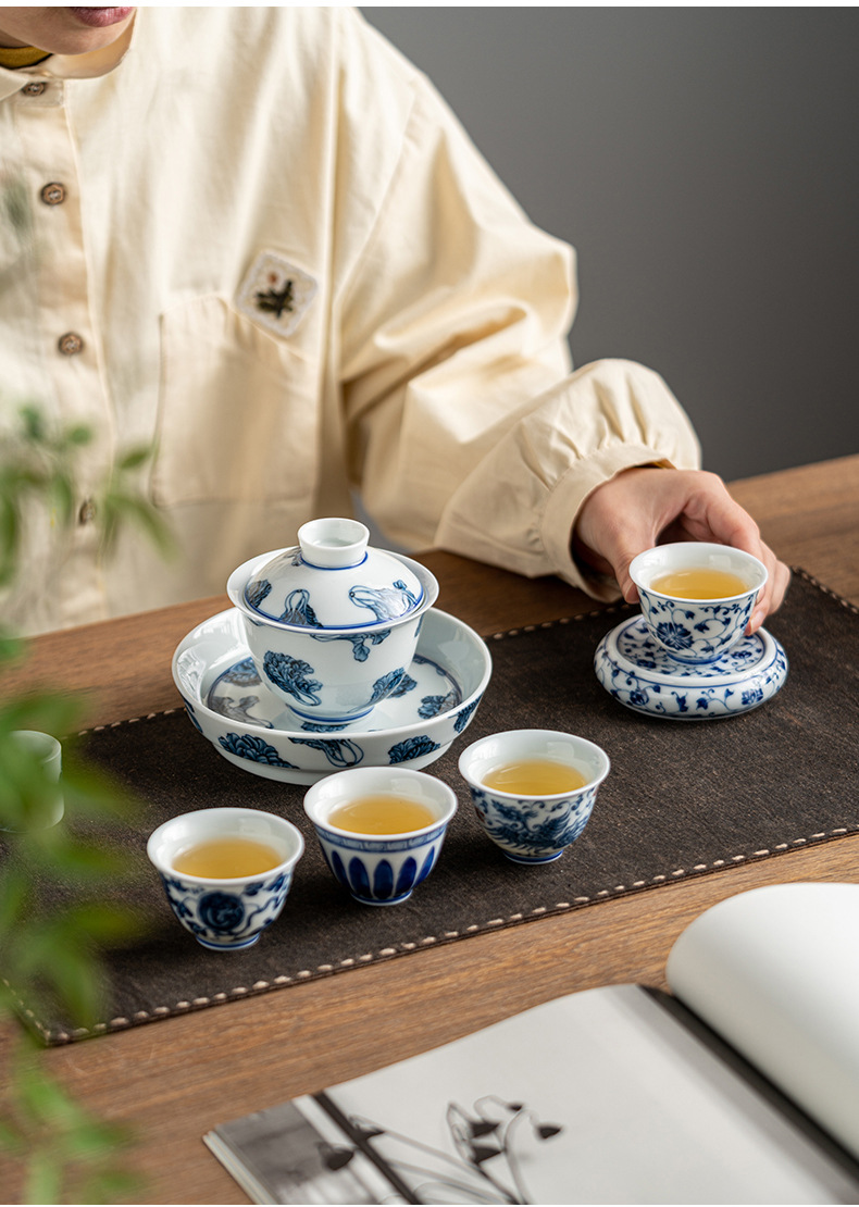 レトロなブルーロータスポット、籐乾燥バブルテーブル、紫砂ポット、ソーサー、大型ヘチマポット、貯水式ティーテーブル