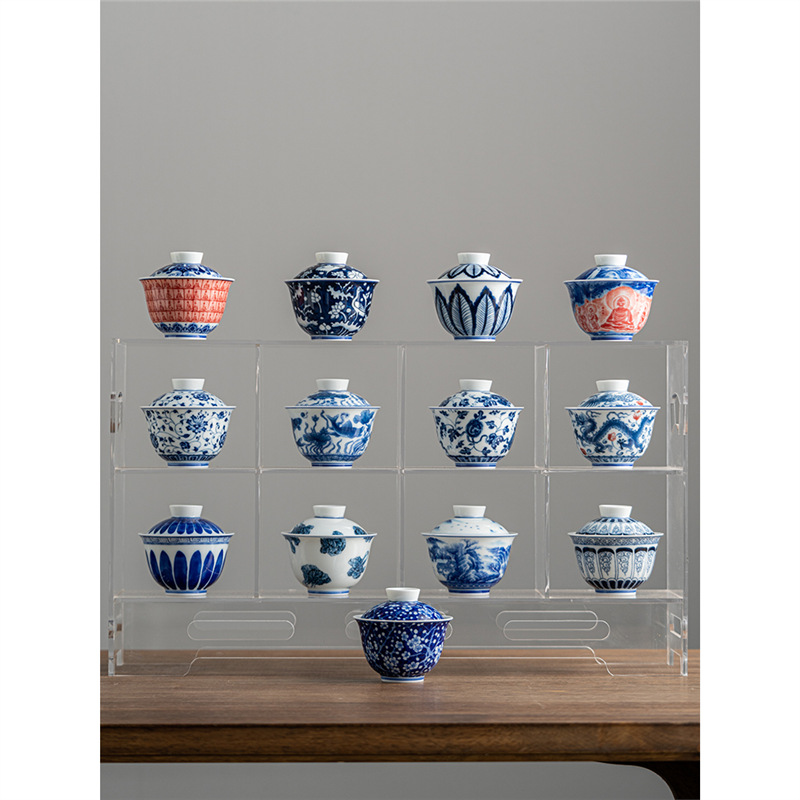 敦煌仏像山水青花磁器釉薬下彩蓋碗工夫茶道具レトロ陶磁泡茶三才蓋碗茶碗