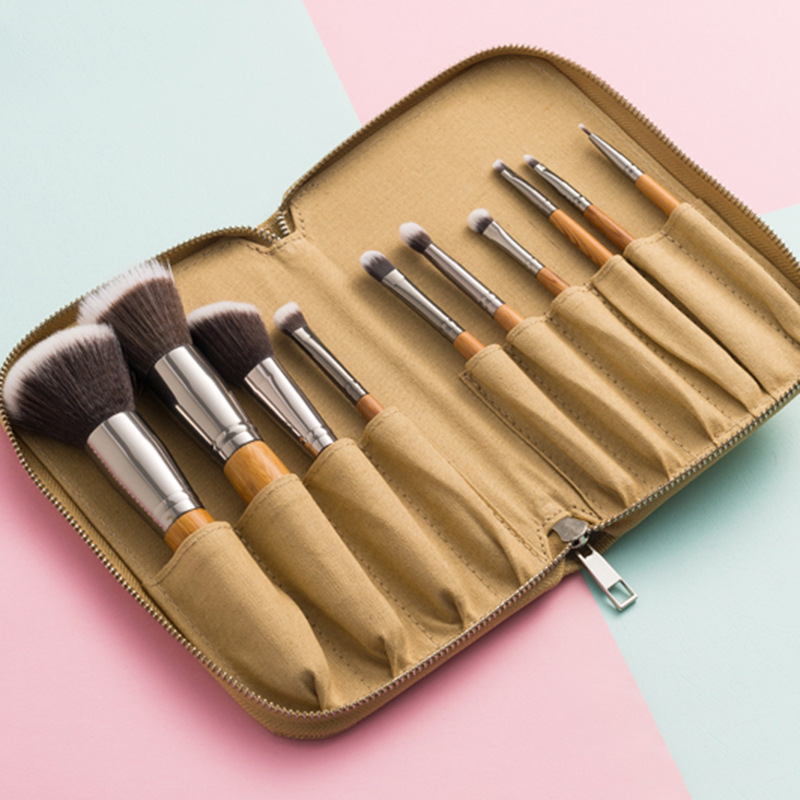 元メーカー10本ナイロン毛茶色竹柄麻布バッグ化粧ブラシ頬紅ブラシ化粧道具