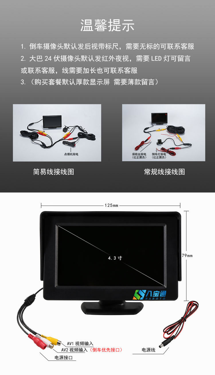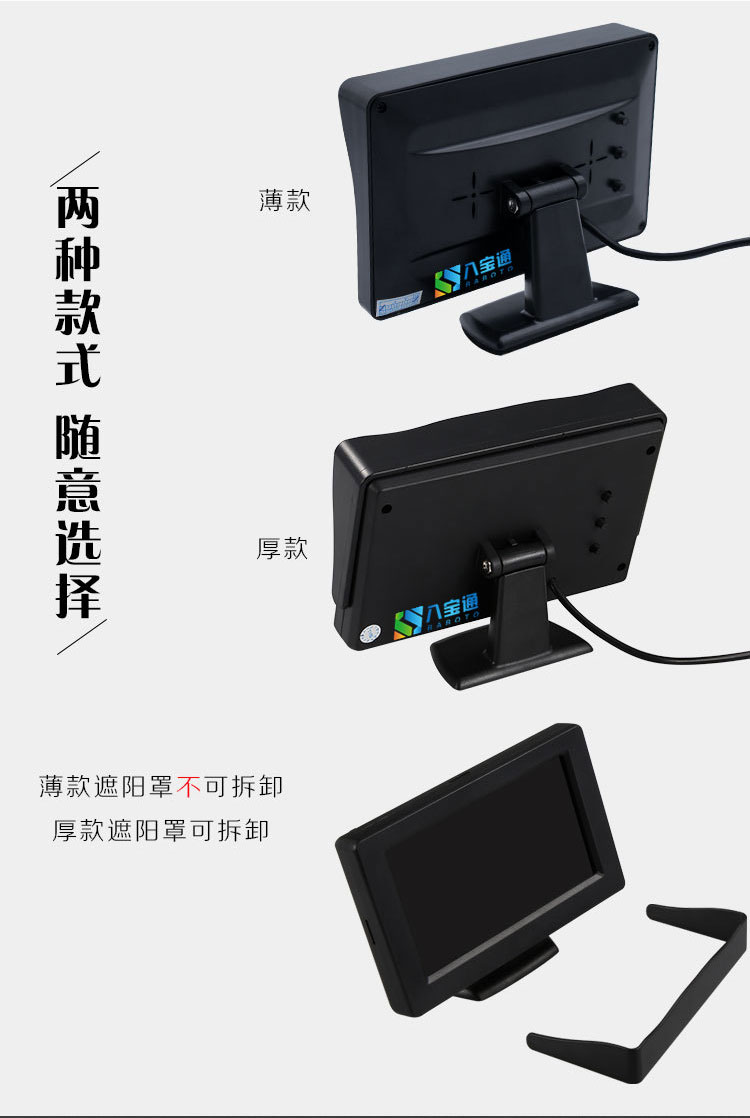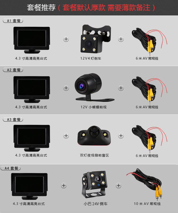 本体サイズ 4.3inch モニター (薄型バージョン) 特別オファー,4.3inch モニター (薄型バージョン) HD 高輝度,4.3inch モニター (厚手バージョン) 高精細かつ高輝度,4.3inch モニター (AHD バージョン) HD とハイライト,5inch モニター (800*480) 高解像度と高輝度,A1(反転画像 - 従来の配線 - 12V),A1 (反転画像-簡易配線-12V),A2 (フロントビデオ - 従来の配線 - 12V),A2(正面画像・簡易配線・12ボルト),A3 (右死角画像 - 従来の配線 - 12V),A3(右死角画像・簡易配線・12V),A4(反転画像-従来配線-24V),A4(反転画像・簡易配線・24V),B1(前方ビュー+後方イメージ-12ボルト),B2 (右死角 + 後方画像 - 12 ボルト)