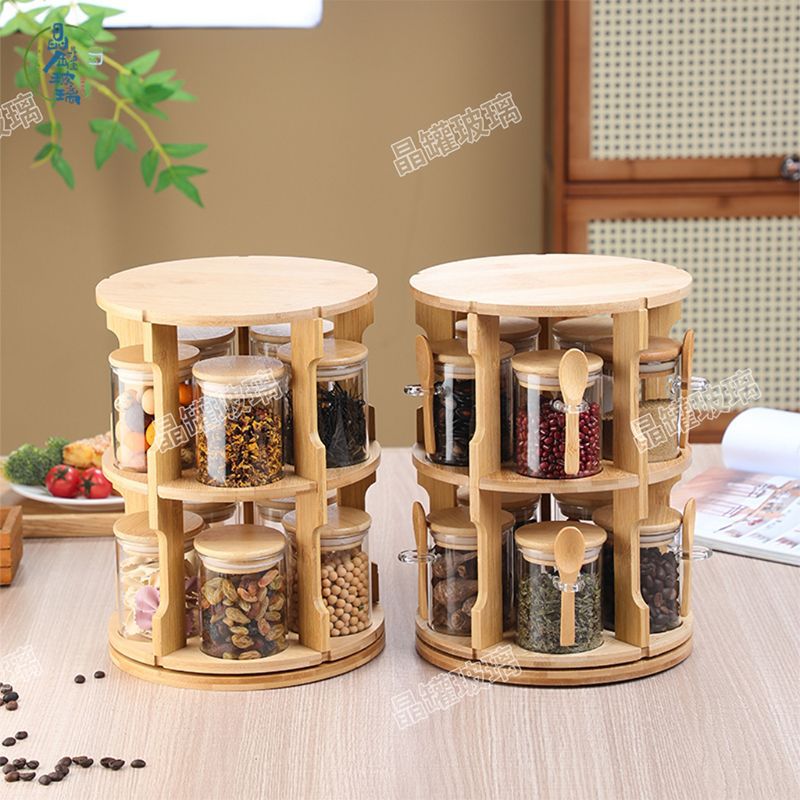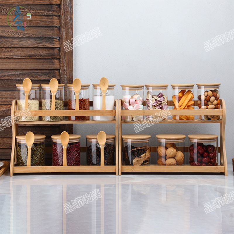 厨房家用香料罐带勺带木架玻璃调料瓶组合套装调味罐茶叶罐展示架