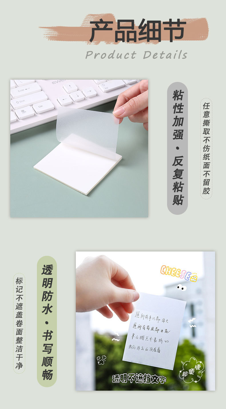 国境を越えたPET透明付箋、剥がせる付箋ブック、学生用ハンドブックメモ紙、ins風防水付箋