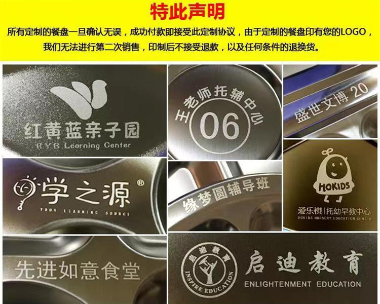 子供用食事皿304ステンレス円形幼稚園学生食堂分格ファストフード皿レーザーロゴ