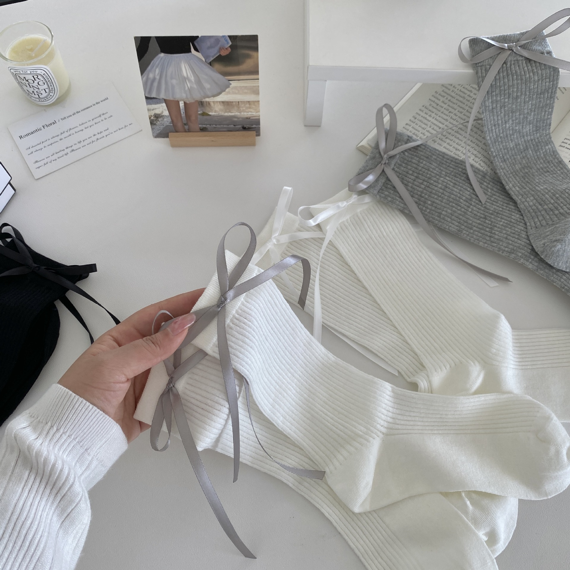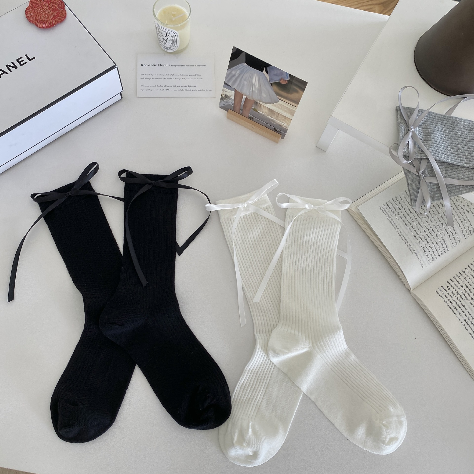 2026年春の女性用ソックス、インスタ映えするリボン付き黒白JKロリータ風万能バレエソックス、ふくらはぎ丈ソックス