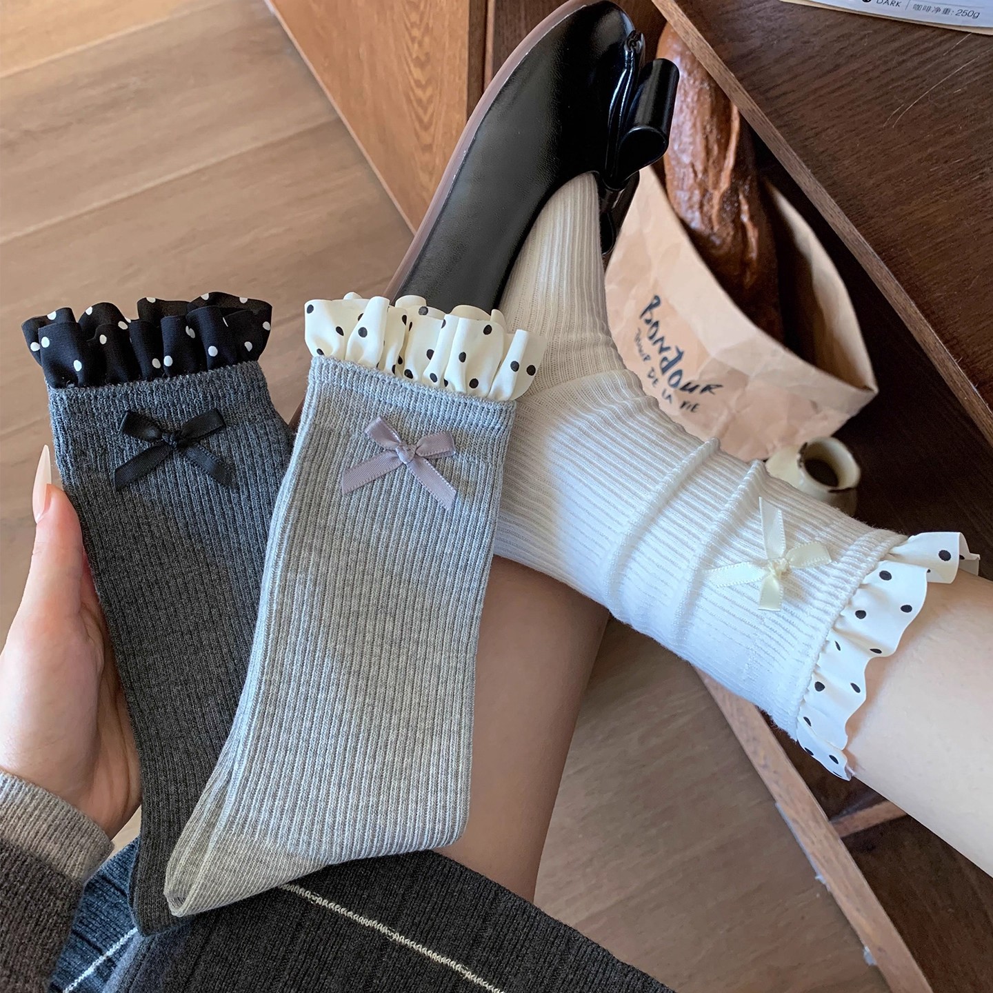 25新款双针纯棉蝴蝶结女min系波点花边罗口灰色中筒堆堆诸暨袜子