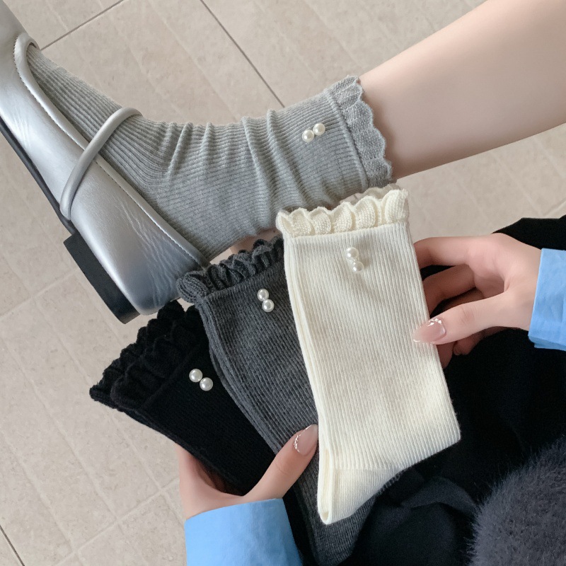 珍珠袜子女2025秋季新款纯色双针中筒袜甜美花边堆堆袜洛丽塔袜子