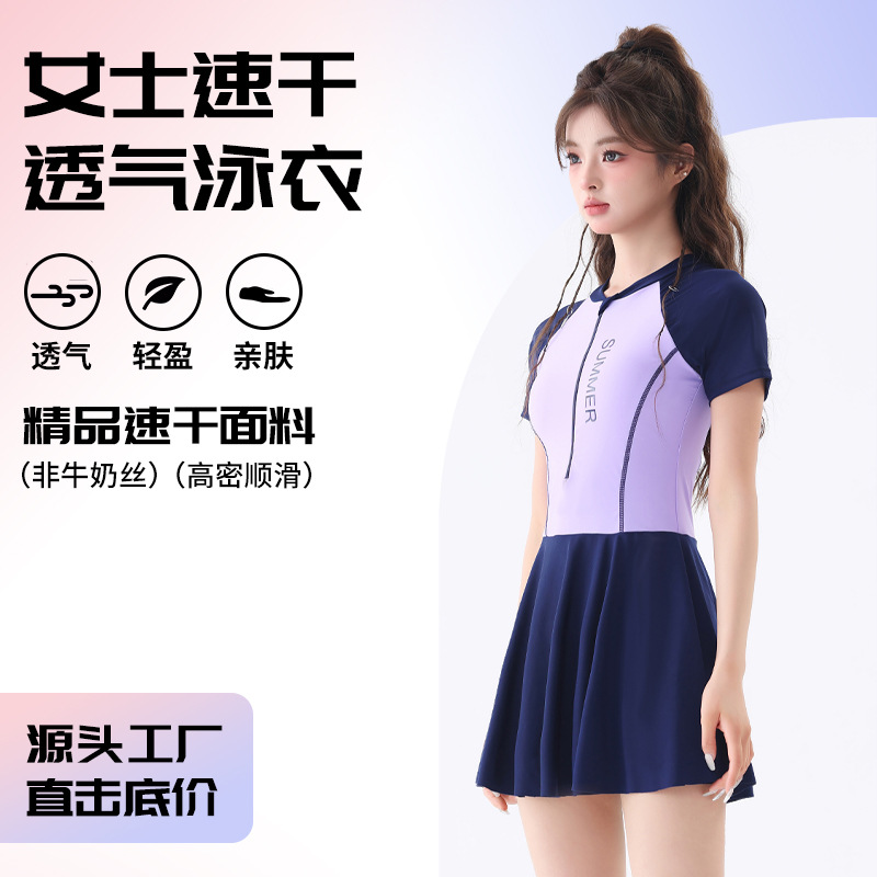 新型高級感速乾ワンピース水着女性長袖ジッパースカート式水着スポーツスタイル通気性がある着痩せ水着