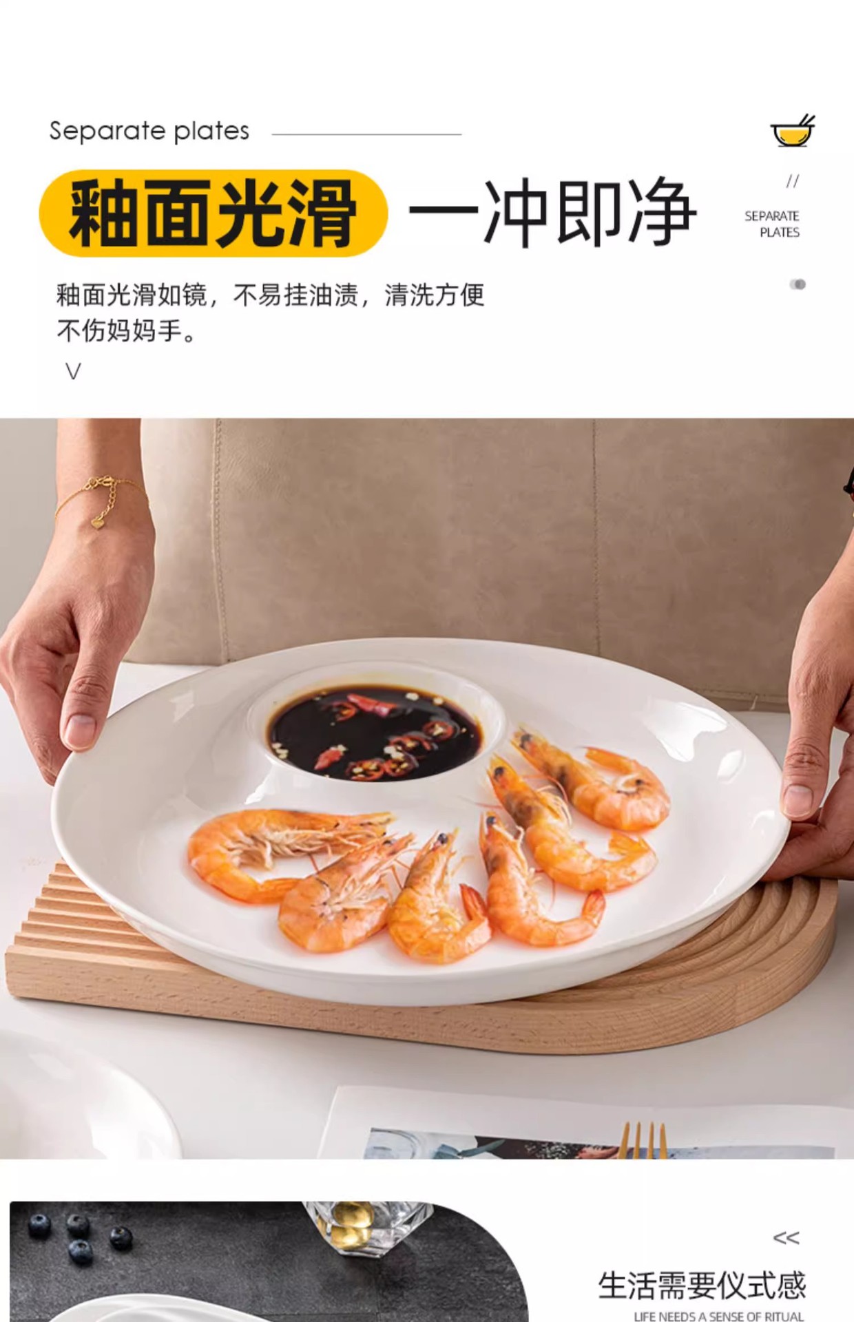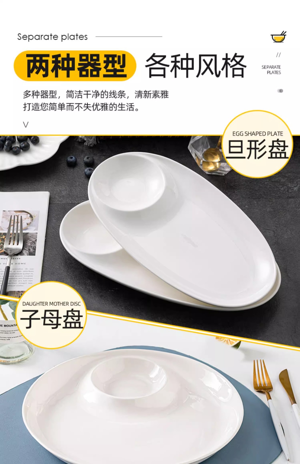 批发纯白陶瓷饺子盘带醋碟白灼虾盘三文鱼刺身圆形旦形子母盘菜盘