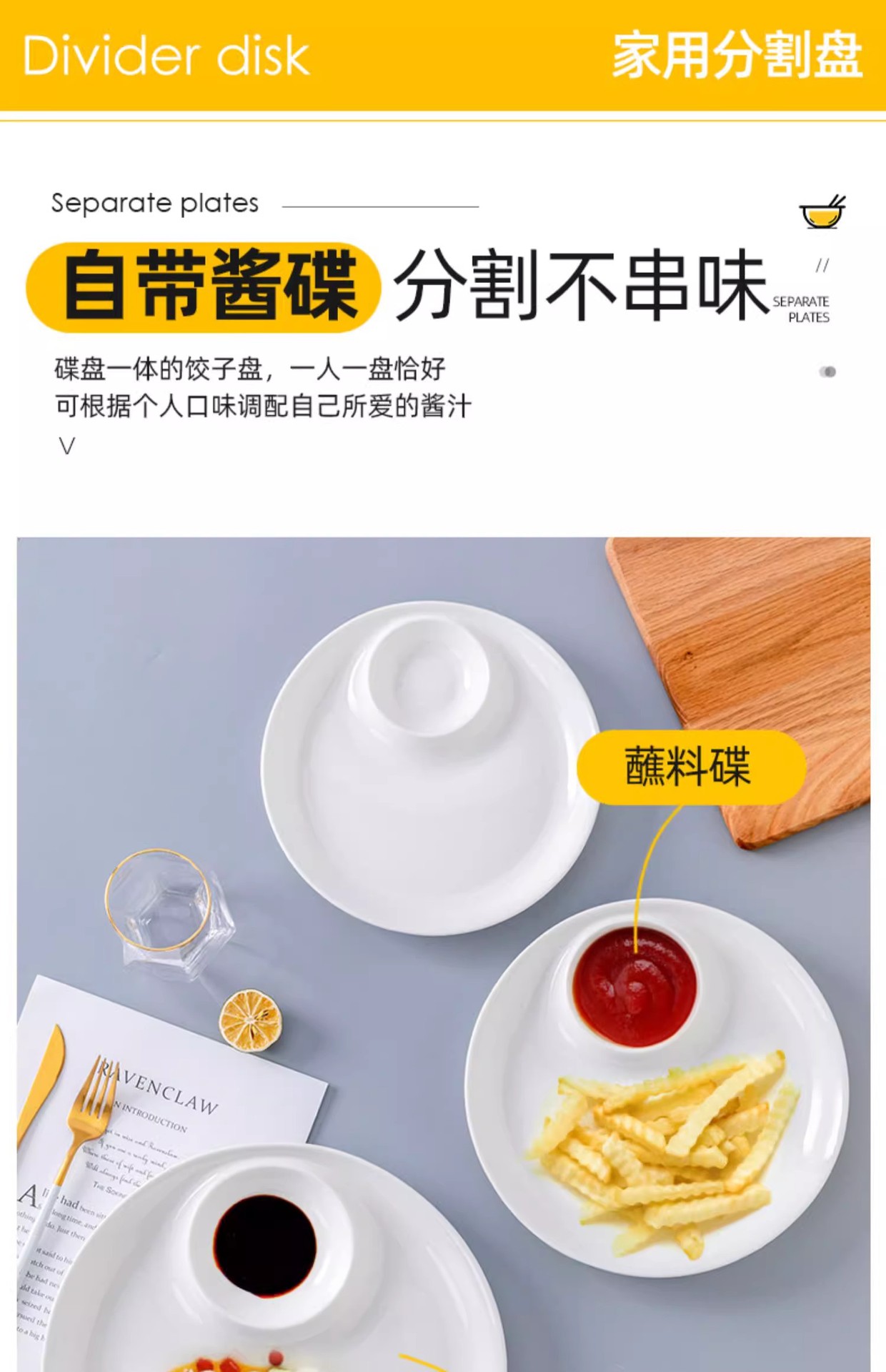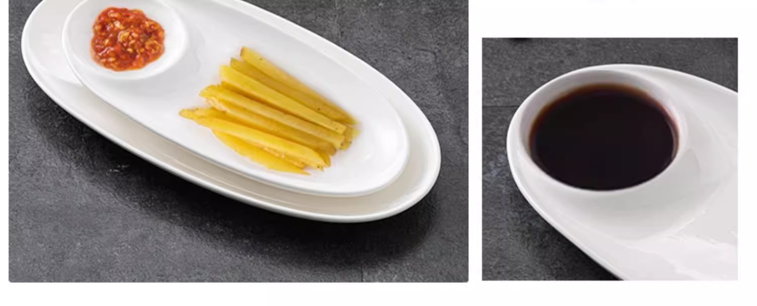 卸売り純白陶磁器餃子皿酢皿付き白灼熱海老皿サーモン刺身円形旦形子母皿皿皿