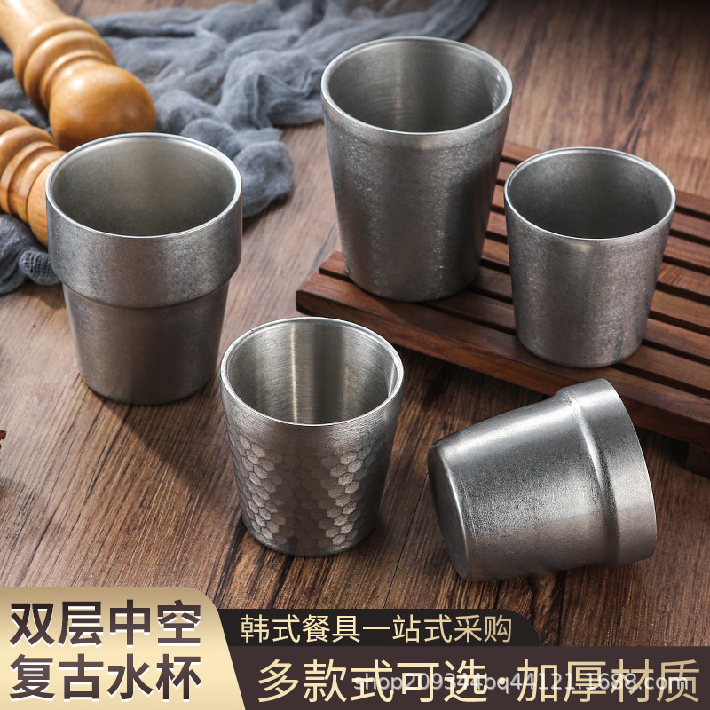 レトロ厚いステンレスコップ二重コップダイヤモンド蜂の巣紋コップ工業風屋外キャンプビールグラス