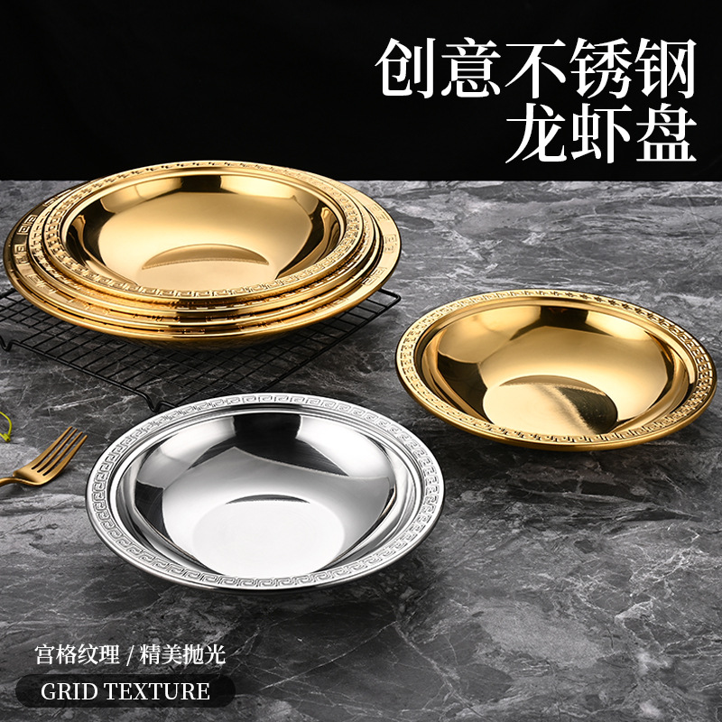 ステンレスの浅いたらいの三盛のアサリのたらいの海鮮の金色のレースの皿のザリガニの専用の平の乾燥している鍋の肉のカニの鍋