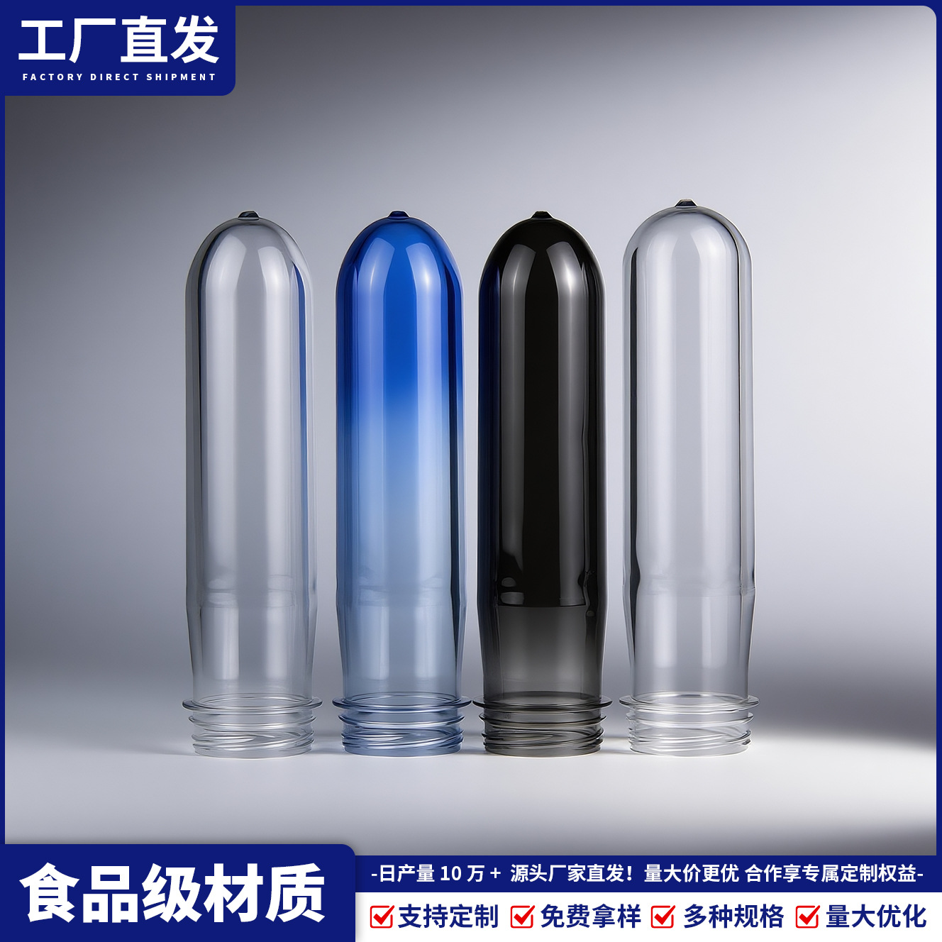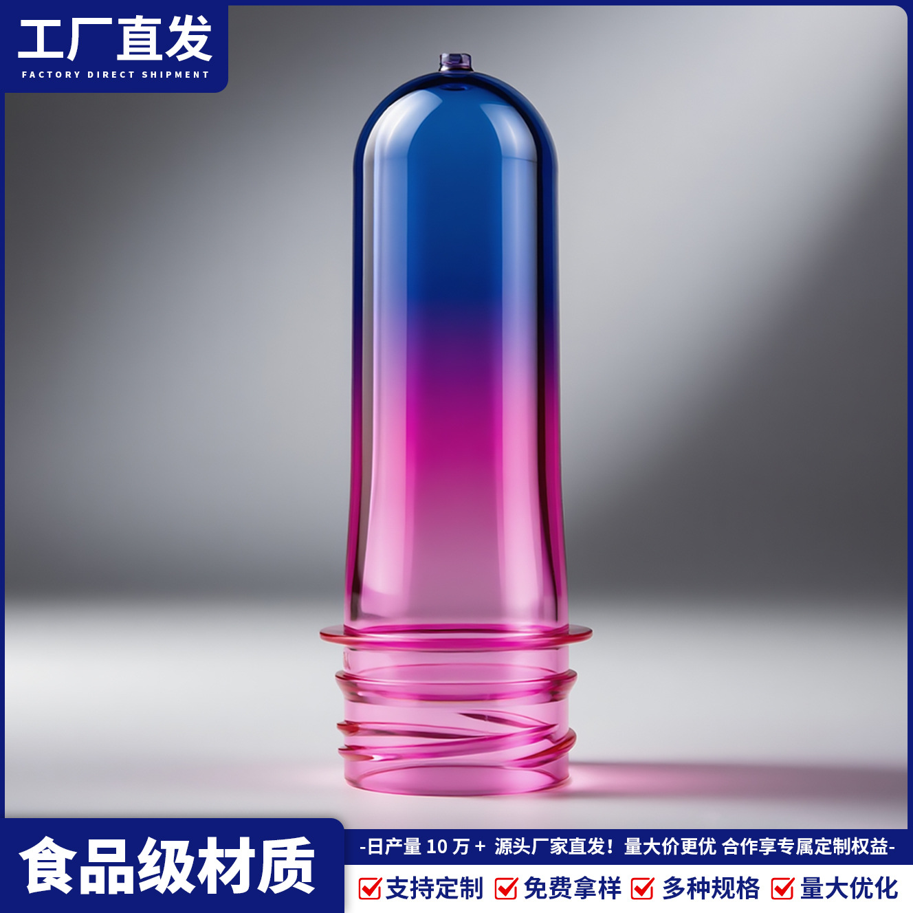 可承接定制各种常规口径、高度、克重、各种配色的PET渐变色瓶胚产品以及模具,欢迎垂询18205766099