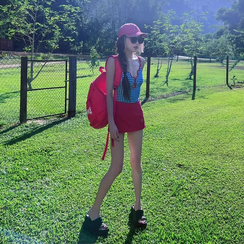 2025年新作女性用スプリット水着スリーピースホットガール甘いチェック柄スリム海辺リゾートスタイル長袖小柄