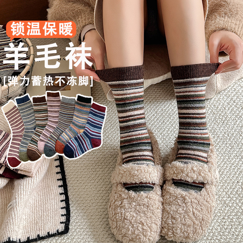 复古条纹中筒袜女秋冬堆堆袜羊毛袜加厚保暖时髦韩版穿搭长筒袜