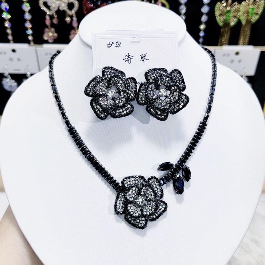 欧美锆石奢华项链耳环套装 黑色玫瑰花佩戴裙装气质精致高级项饰
