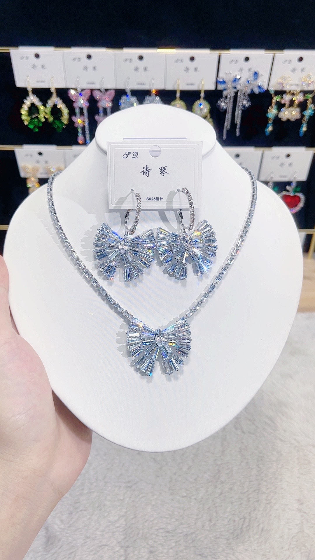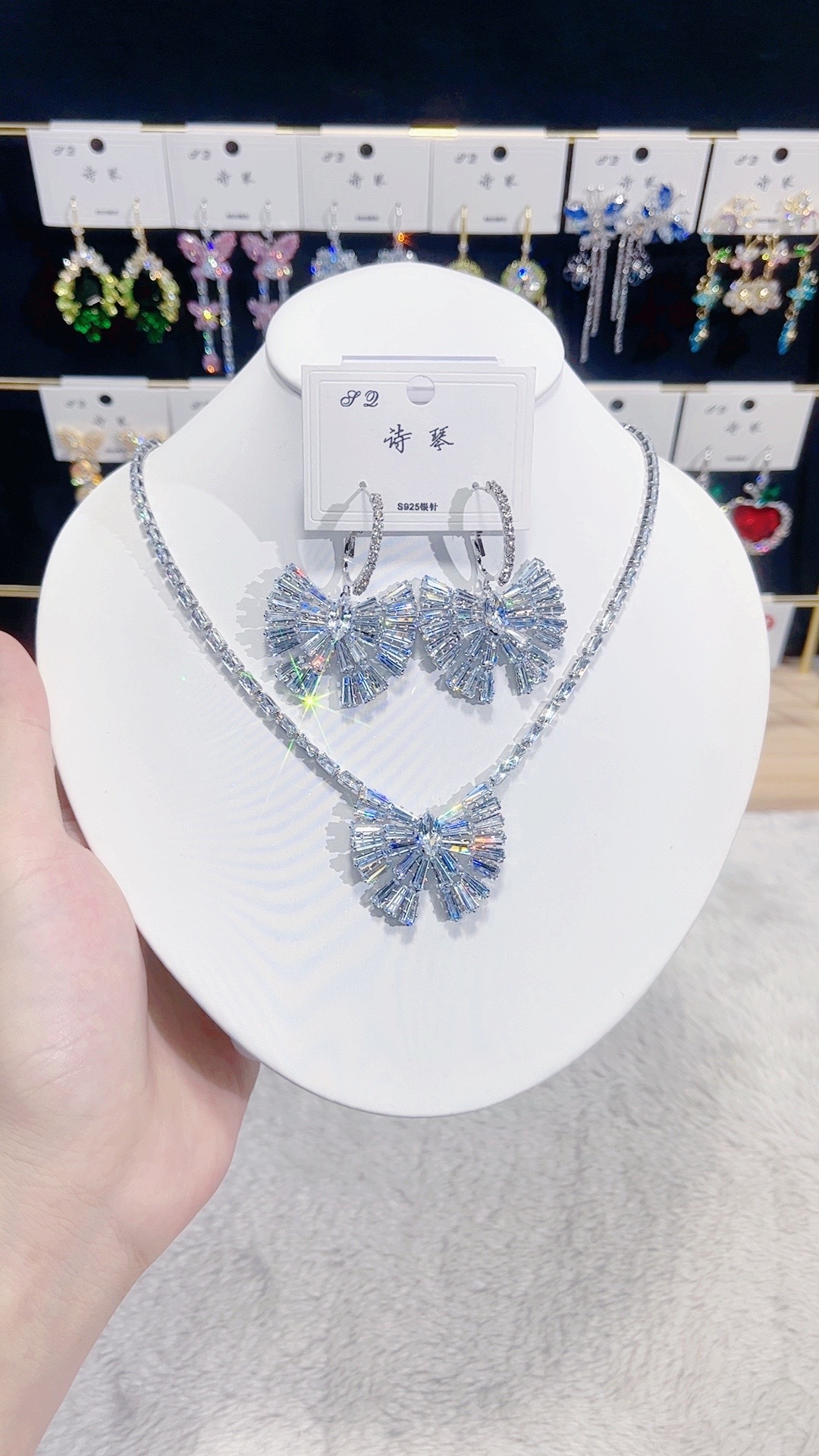 ファッショントレンドジルコン贅沢ネックレスイヤリング白蝶ネクタイセットins生放送起爆着スカート着用