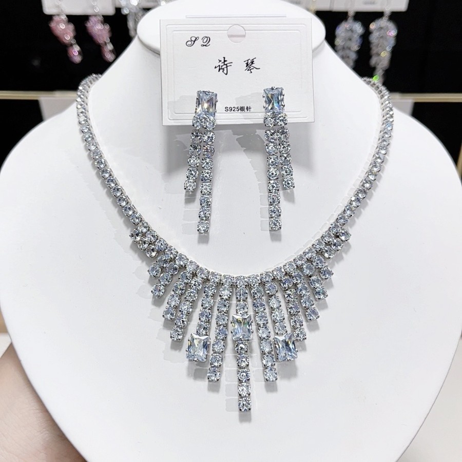 カラージルコンファッション贅沢ネックレスイヤリングセットins高級感925銀針イヤリングジルコンネックレス重工