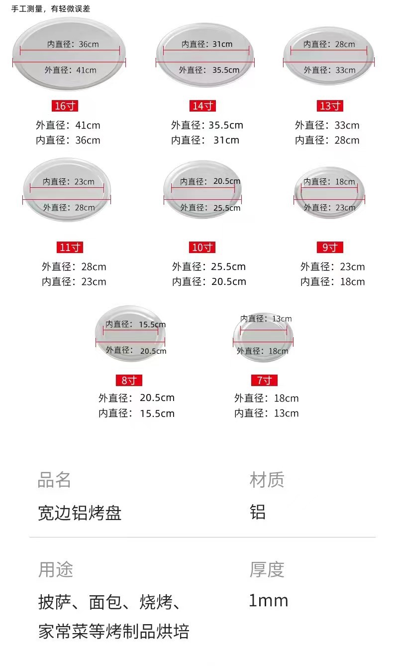 厚い幅のピザ皿アルミ製ピザ皿7-16インチ粘着しないピザ皿焼き円形焼き皿