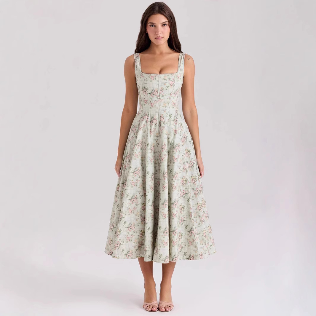 HCB同款欧美夏季一字领吊绑带修身高腰中长款连衣裙印花工厂直批