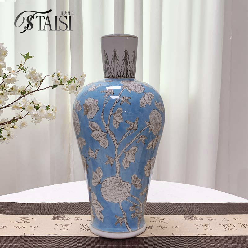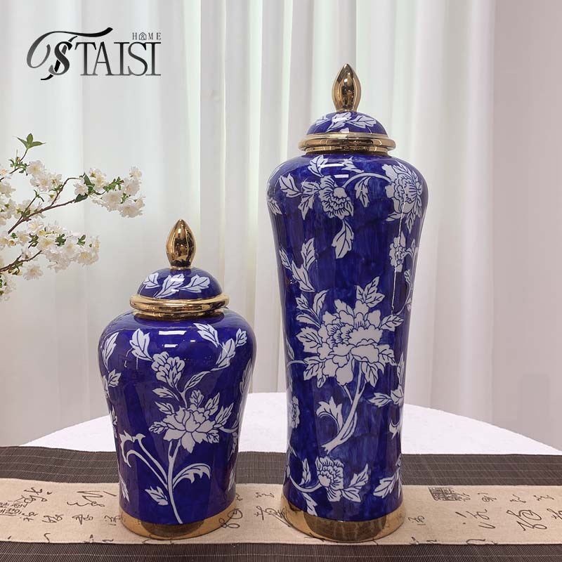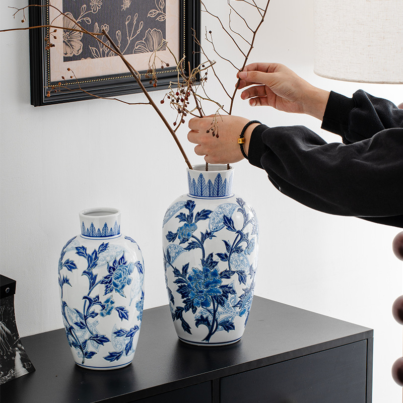 ライトラグジュアリースタイル青底将軍瓶セラミック花瓶ヴィラモデルルームセラミック中国花瓶青と白の磁器セラミック花瓶