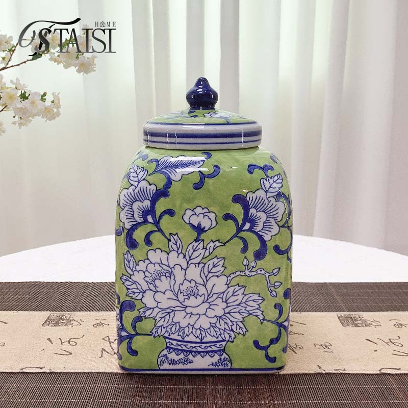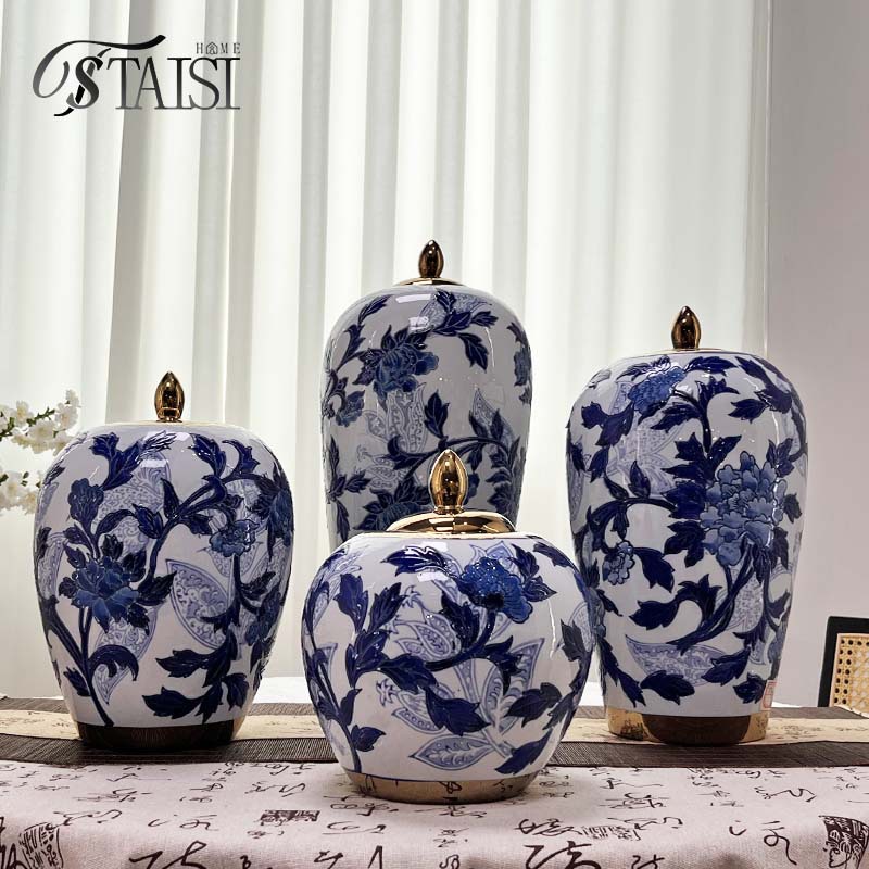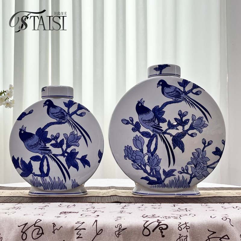 景徳鎮錦鳥青花陶磁器花瓶将軍缶茶葉缶貯蔵タンク新中国式客間博古装飾品