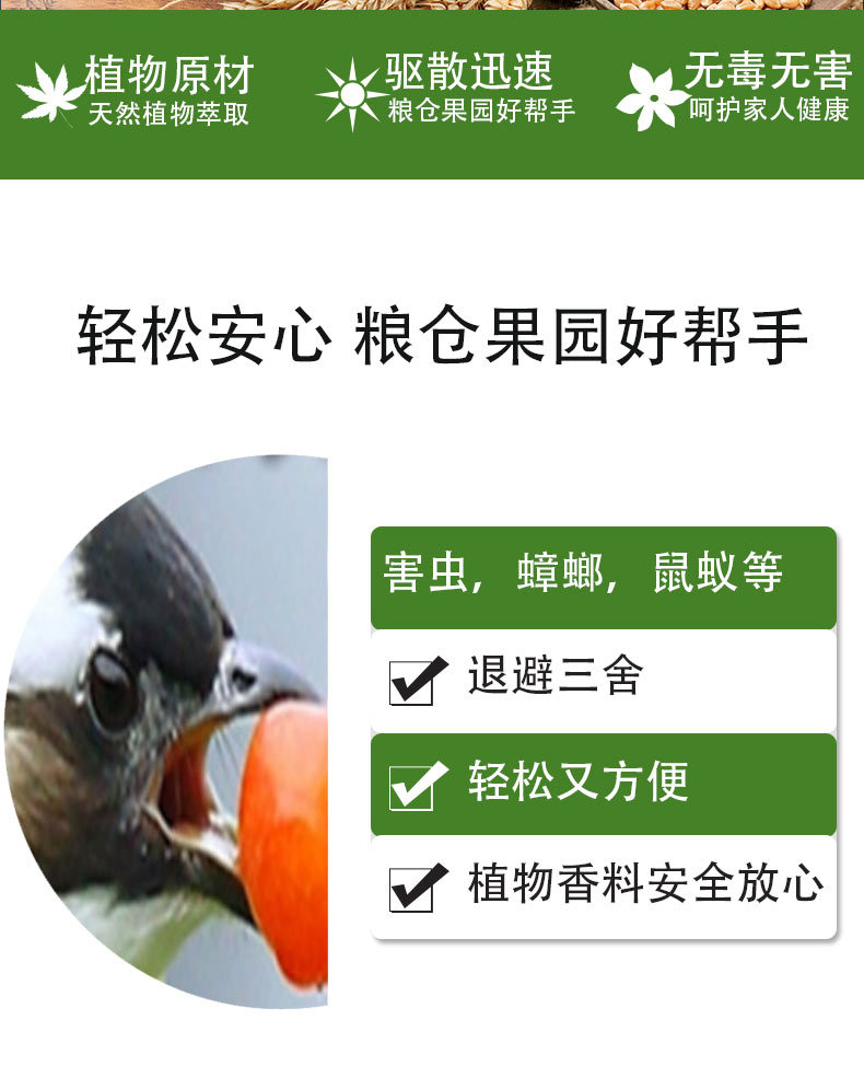 鳥を駆除して虫を追いかける果樹園の食糧倉庫のにおいは鳥を防ぐ植物の食糧の満倉の複合の原料の香料を掛けて香料を包んで包みます。