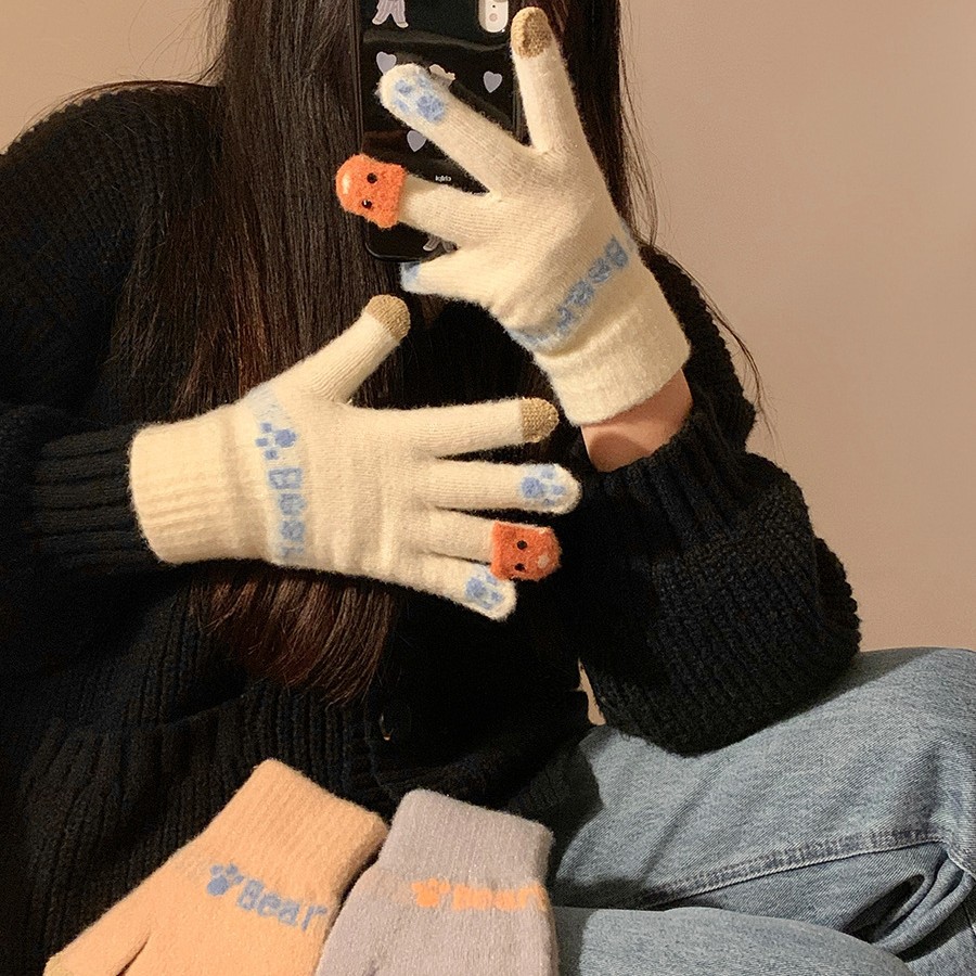 冬季毛绒针织五指手套女秋冬可爱保暖加厚学生骑车可触屏防风防寒