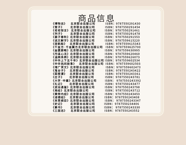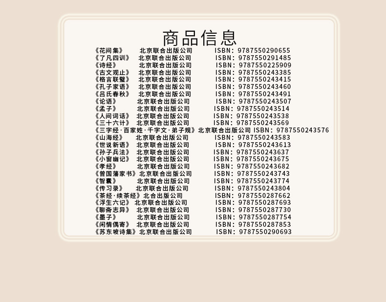カラー 唐詩三百首,増広賢文,格言,文を言って字を解く,晏子春秋,蘇東坡の詞集,閑情偶送,墨子,聊斎志異,浮生六記,茶経・続茶経,伝習録,資治通鑑,知恵袋,易経,孫の兵法,小窓幽記,道徳経,本草綱目,史記,詩経,素書,36計,孝経,中華上下五千年,温病条弁,古文観止,花間集,凡庸四訓,孔子家語,呂氏春秋,論語,孟子,人間の言葉,三志国,単冊-三字経・百家姓・千字文・弟子規,世説新語,曾国藩家書,博物館誌,パイプ,老老恒言,列子,千金方千金翼方,金要略,丹渓心法,鬼谷子,菜根譚,庄子,大学・中庸,礼記,荀子,山海経