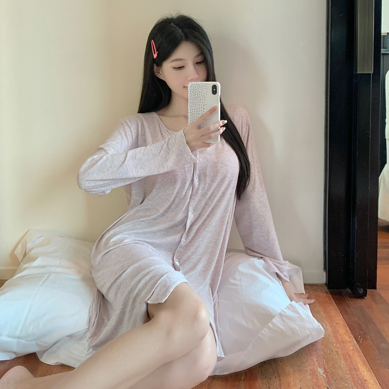 外贸跨境秋季睡衣女长袖睡裙纯欲风带胸垫莫代尔人棉薄款家居裙