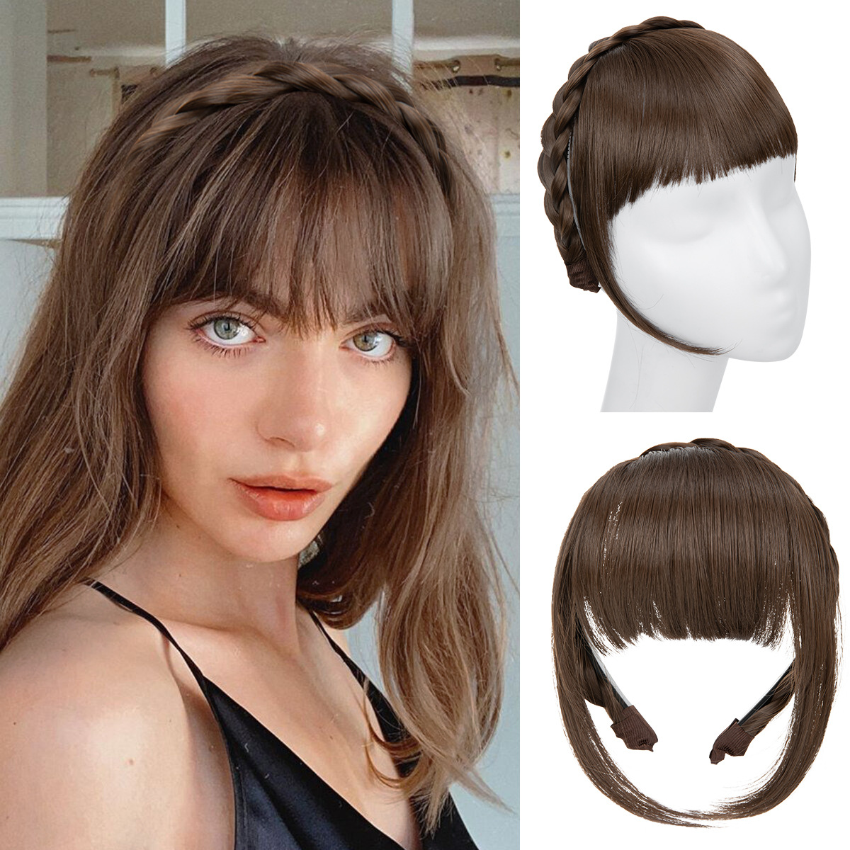 ヨーロッパとアメリカのヘアバンド、ウィッグ、前髪一体型、編み込みヘアピン、白髪隠し、目立たない、跡が残らない、頭頂部自然な前髪ウィッグ