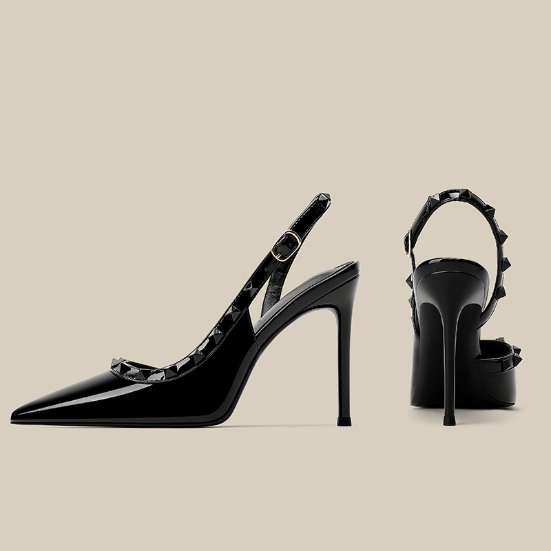 YSメタルスクエアトゥ細ヒールハイヒールレディースシューズ2024秋冬包頭サンダル黒シングルシューズ配色デザイン光沢仕上げ