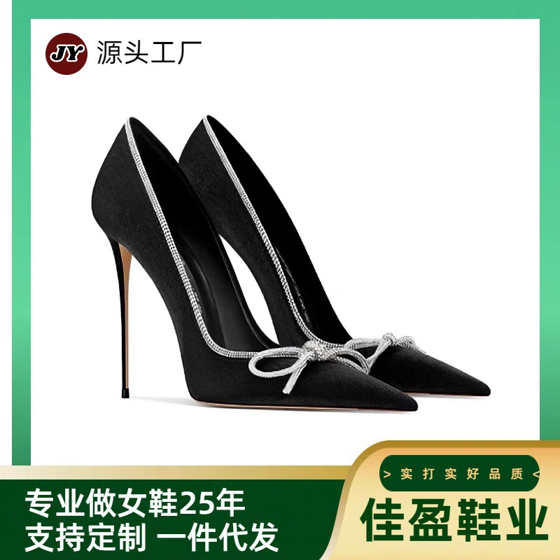 絶美2025年の新型の黒い蝶結びの先の細いハイヒールの女性の浅い口の靴の百合の気質の靴
