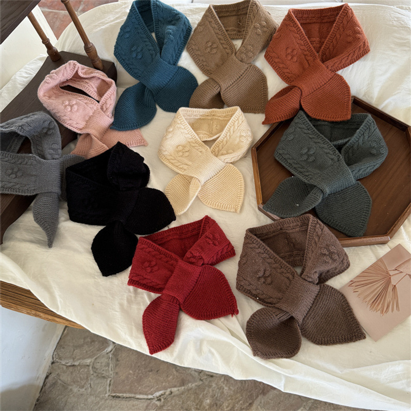 韩版儿童复古豆豆交叉围脖男女童纯色百搭针织小围巾冬宝宝保暖潮