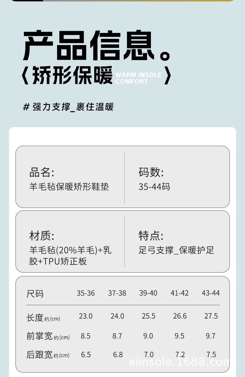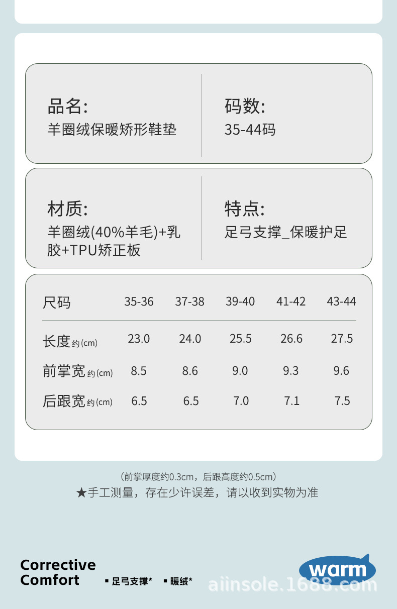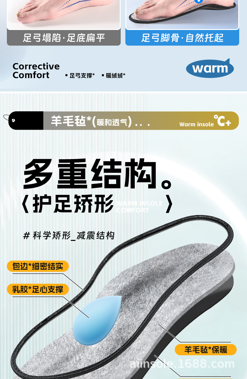 羊毛製扁平足用厚底保温長毛矯正アーチサポートインソール、衝撃吸収秋冬モデル、海外貿易卸売