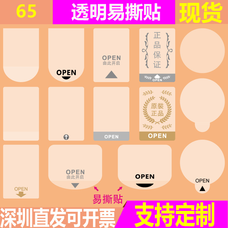 間隔が引き裂きやすいOPEN尾部に糊なし透明矢印ラベル包装箱化粧品シール