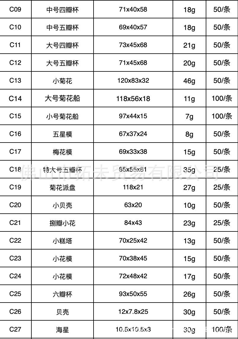 仕様 C09 中四弁カップ,C10 中五弁カップ,C11 大型四弁カップ,C12 ラージ5弁カップ,C13 小菊,C14 大型菊船,C15 小菊ボート,C16 5つ星モデル,C17 梅の花型,C18 特大五弁カップ,C19 菊パイプレート,C20スモールシェル,C21 八重の花,C22小型ケーキタワー,C23 小花型,C24 小花型,C25 6枚の花びらカップ,C26シェル,C27 ヒトデ