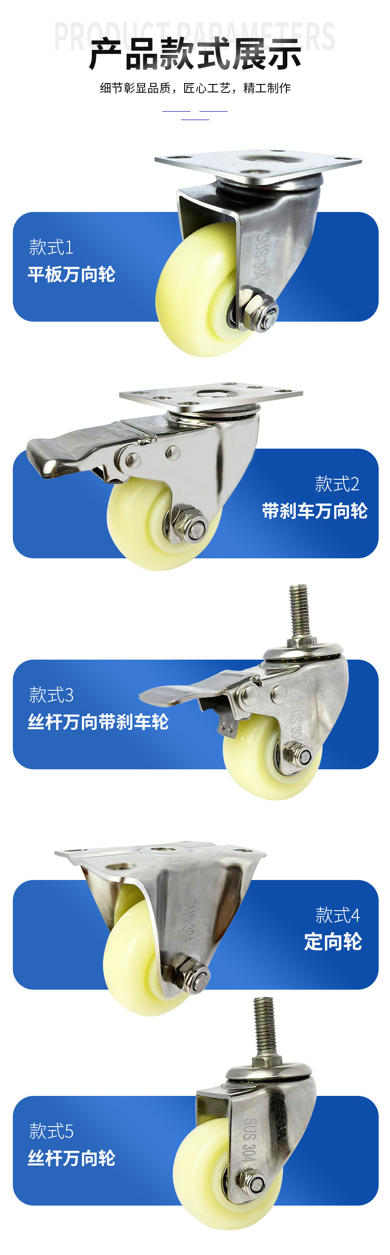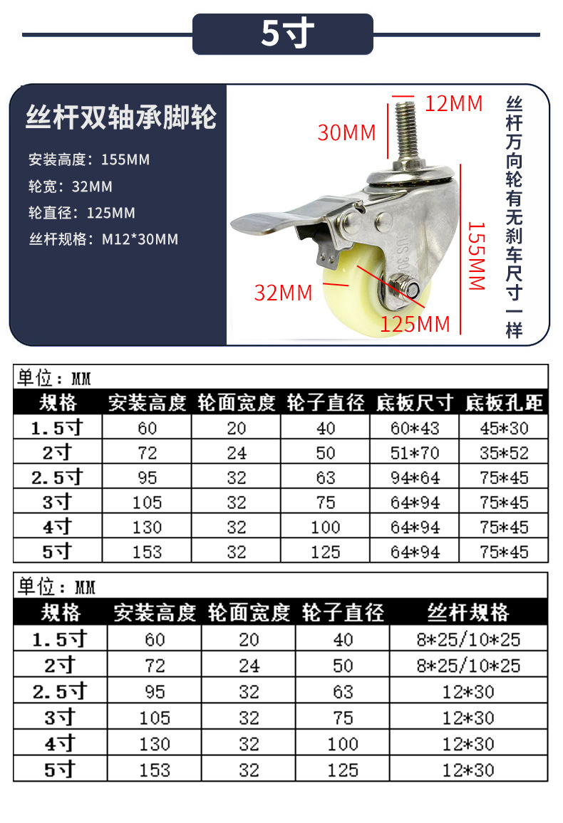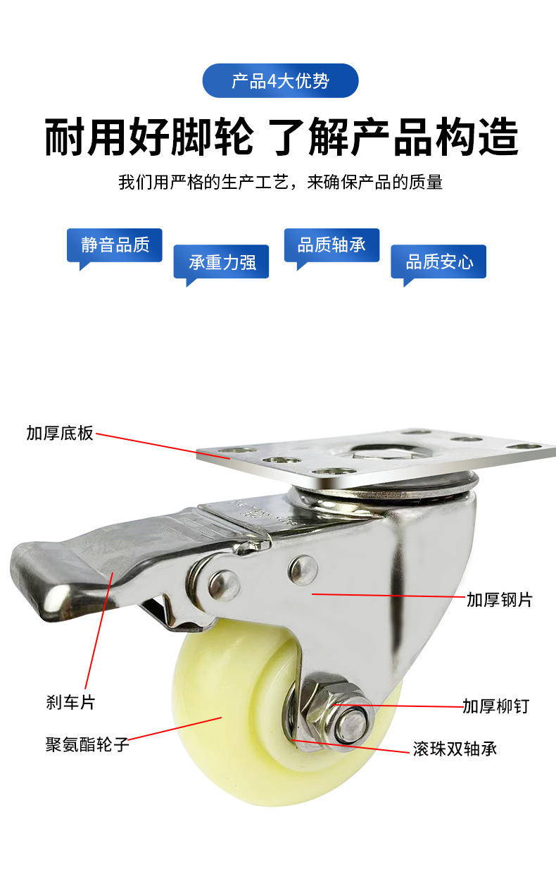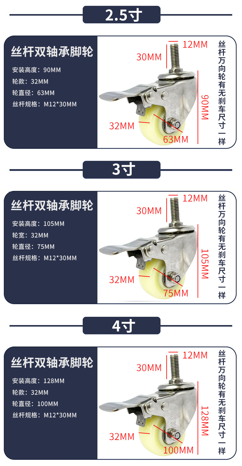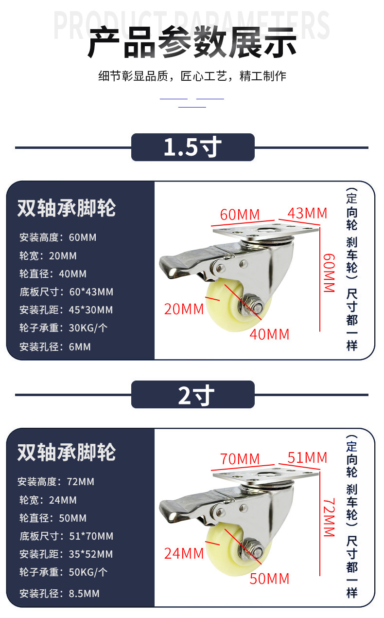 9】中型304ステンレス白PPキャスター 1.5inch 2inch 2.5inch 3inch 4inch 5inch